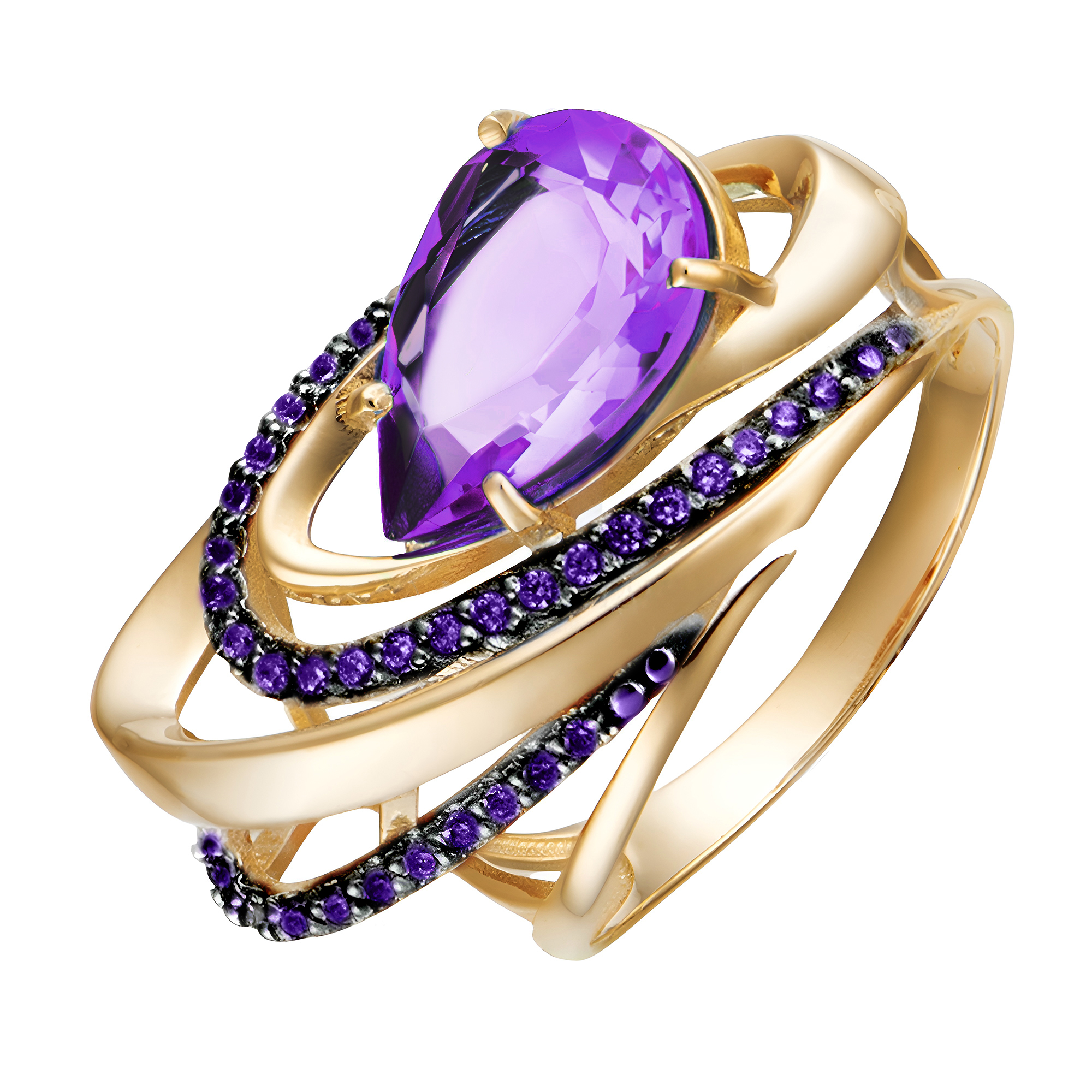 Кольцо объемного дизайна из красного золота 585 пробы декорировано великолепным аметистом грушевидной формы огранки в обрамлении фигурных дорожек с сияющими фианитами. Эффектное украшение не останется незамеченным, и отлично впишется в стильные образы современной леди. Приобретайте ювелирное украшение в подарок по выгодной цене в магазинах Мир Золота.