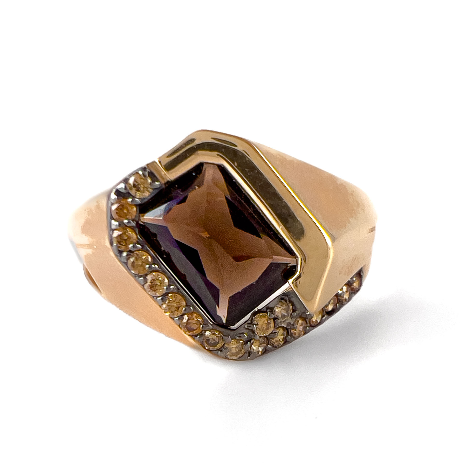 Золотое кольцо с таинственным раухтопазом, дополненное чередой фианитов, выглядит дорого и роскошно. Теплый оттенок камня невероятно эффектно сочетается с красным золотом, создавая свечение. Кольцо с раухтопазом станет талисманом для людей творческих профессий – поэтов и писателей, музыкантов, скульпторов и художников. Купите красивое золотое кольцо в ювелирных магазинах Мир Золота.