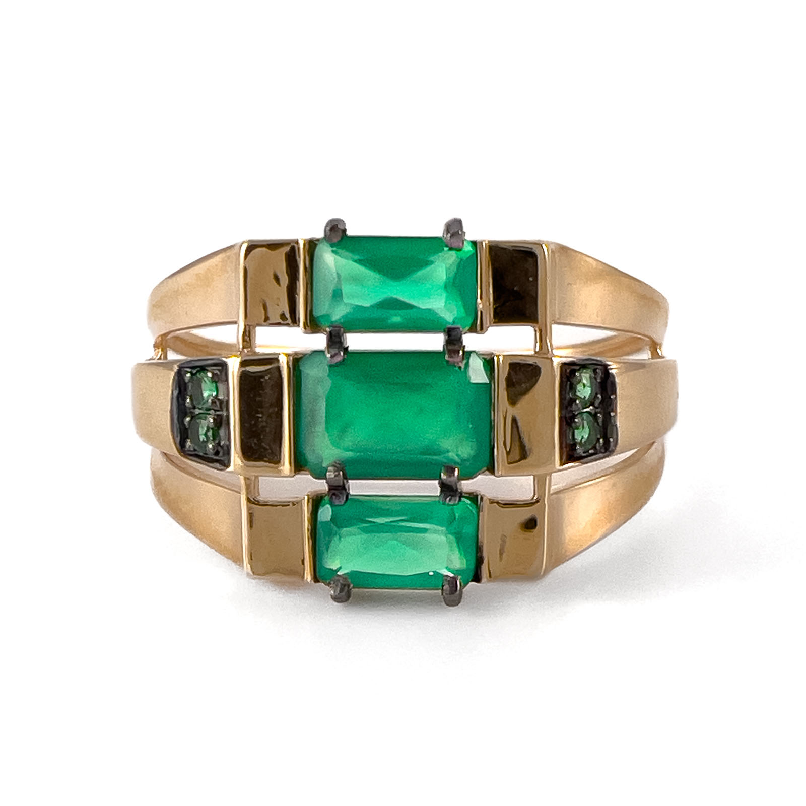 Оригинальное кольцо выполнено в современном стиле из красного золота 585 робы, украшено зелеными агатами и фианитами. Яркое украшение сделает женский образ более эффектным и стильным. Кольцо отлично впишется в любые трендовые образы и подчеркнет индивидуальность владелицы. Приобретайте украшение по выгодным ценам в магазинах Мир Золота.