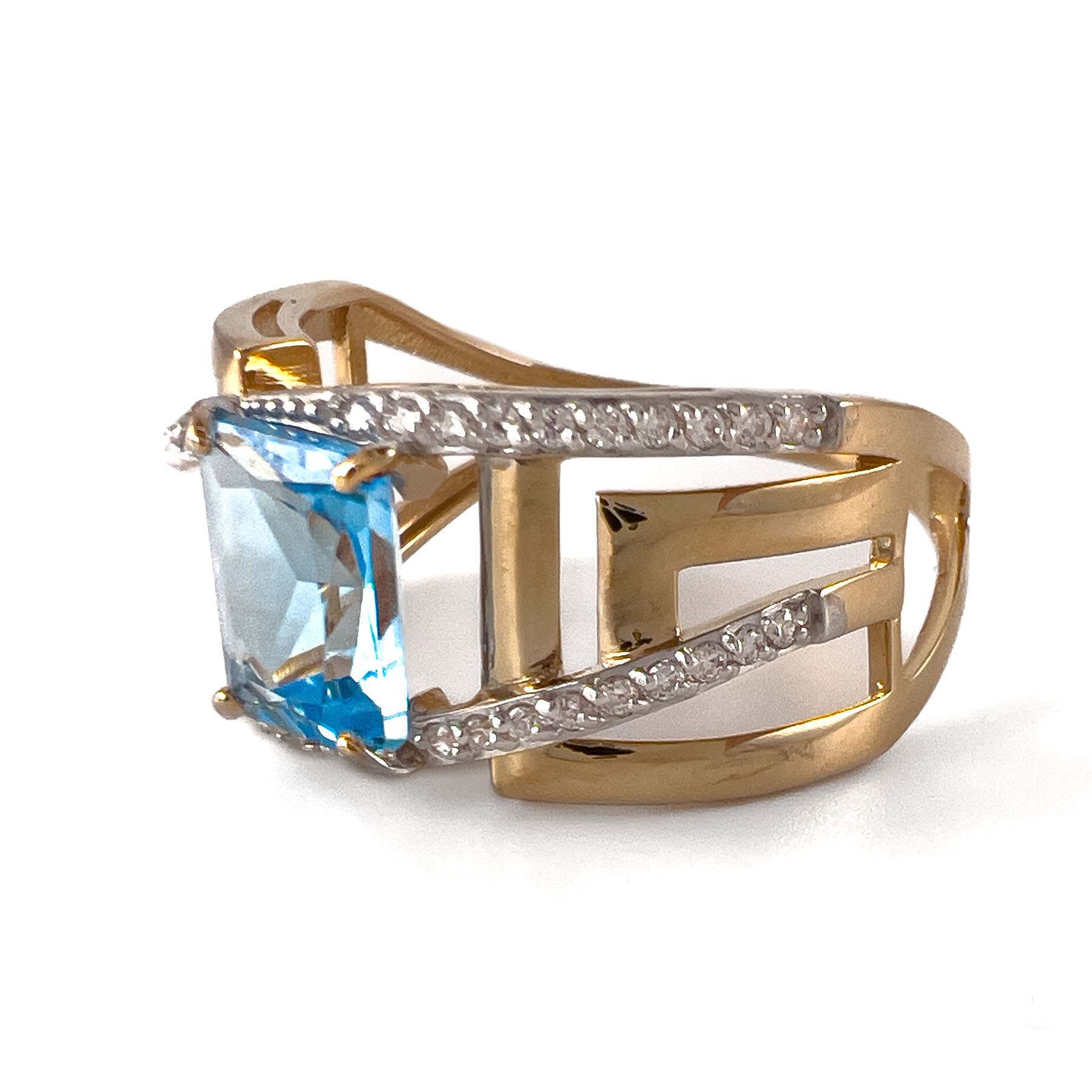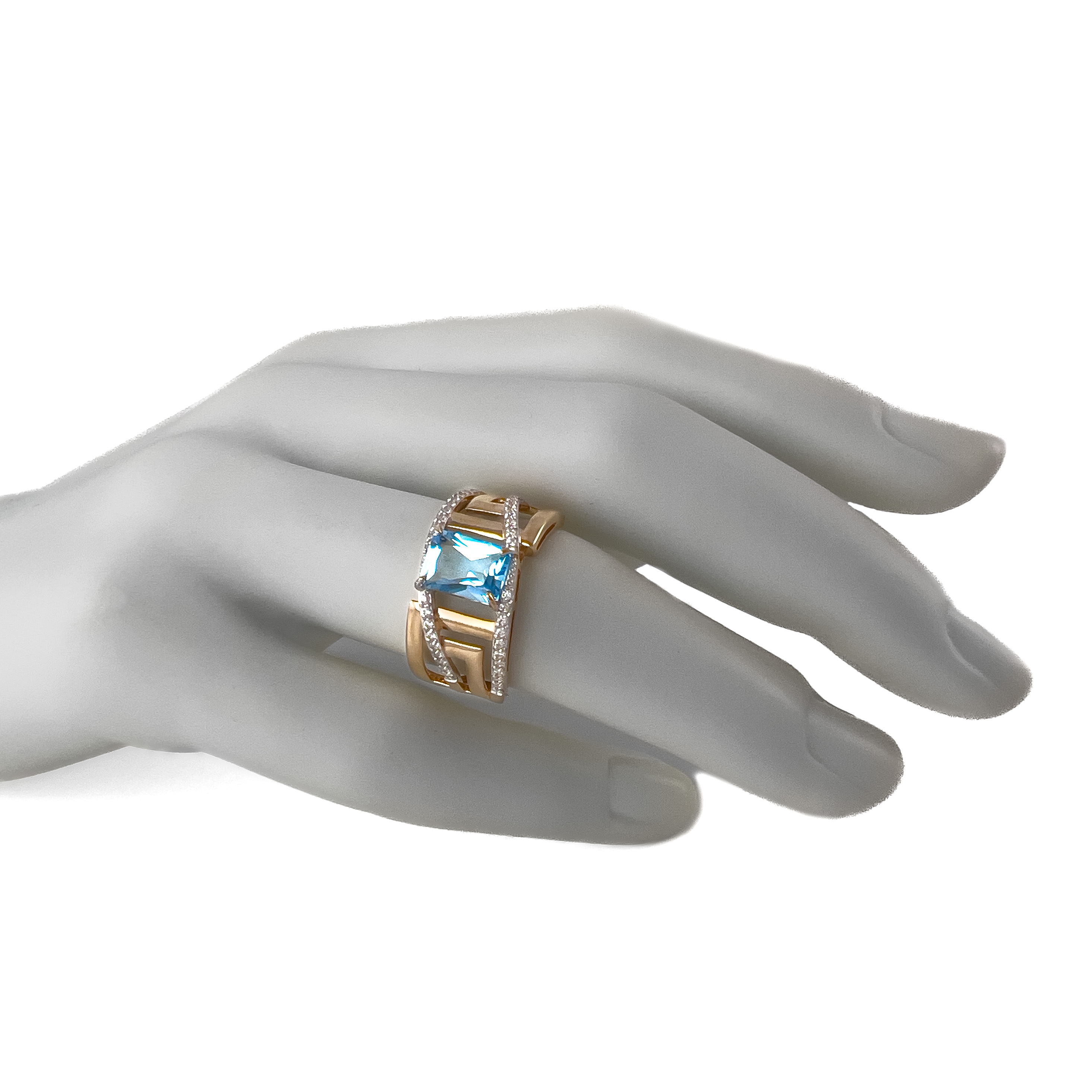 Эффектное кольцо из красного золота 585 пробы с нежно-голубым сиянием топаза "swiss", подчеркнутым дорожками кристальных фианитов. Оригинальный стиль кольца отлично дополнит современный женственный образ, добавит ему нежности и очарования. Приобретайте великолепное кольцо по выгодным ценам в магазинах Мир Золота.