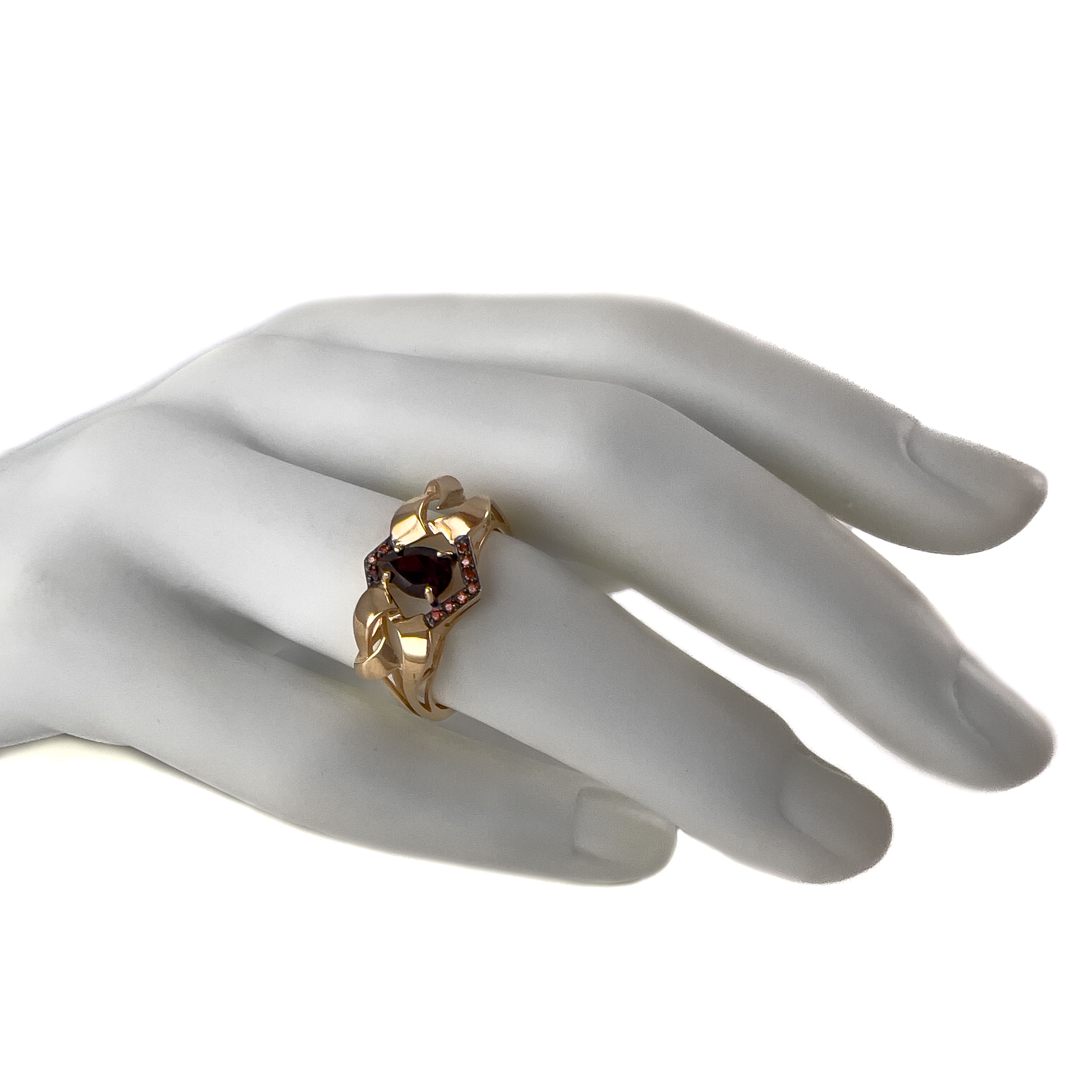 Превосходное кольцо необычного дизайна выполнено из красного золота 585 робы и декорировано гранатом и цветными фианитами. Замечательное кольцо с красным гранатом грушевидной огранки, подчеркнутым сиянием цветных фианитов, станет выразительным акцентом безупречного образа владелицы. Приобретайте кольцо выгодно в магазинах Мир Золота.