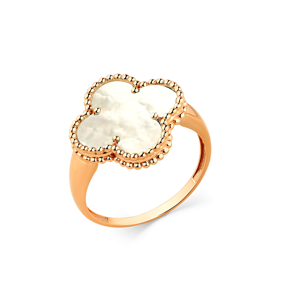 Притягательное кольцо из красного золота 585 пробы с оригинальной вставкой в виде четырёхлистника с белым перламутром. Выразительный дизайн кольца выгодно подчеркнет привлекательность и женственность владелицы. Нежное и изящное украшение отлично дополнит как повседневный, так и праздничный образ. Приобретайте великолепное украшение по выгодным ценам в магазинах Мир Золота.