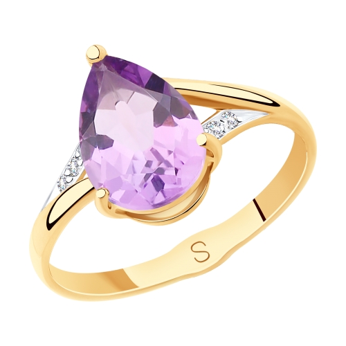 Изумительное кольцо из красного золота 585 пробы с аметистом и фианитами. Притягательный аметист грушевидной огранки закреплен в воздушной оправе, подчеркивающей всю природную прелесть камня. Яркий и женственный аксессуар будет отличным дополнением к элегантному вечернему наряду. Приобретайте ювелирное украшение по выгодным ценам в магазинах Мир Золота.