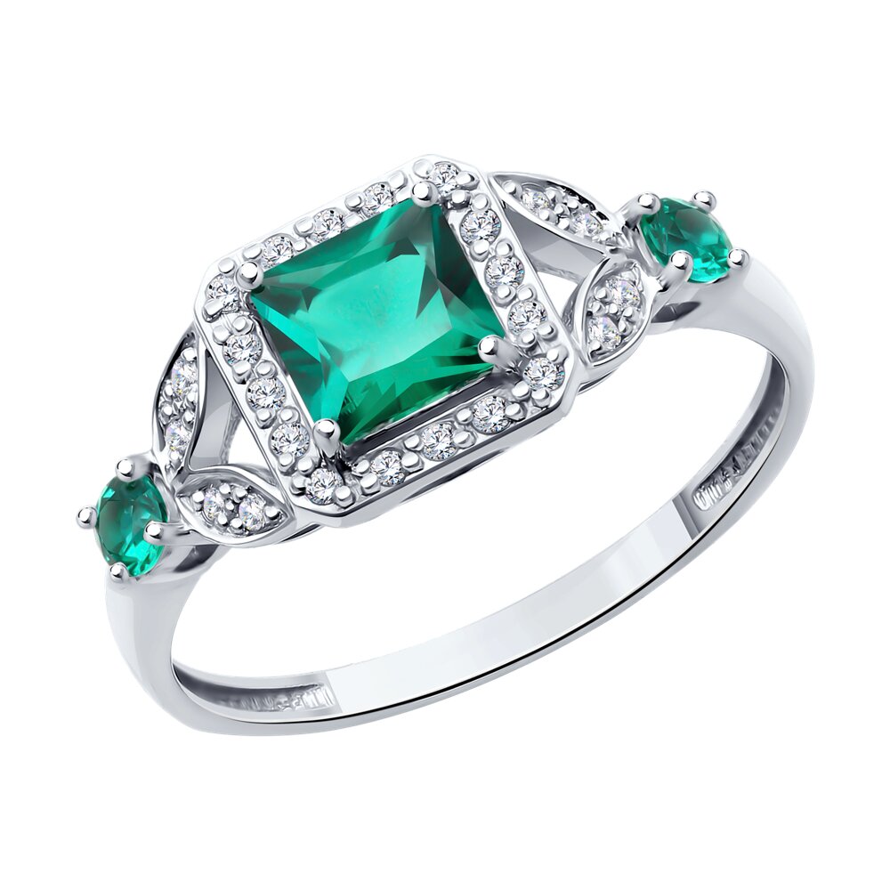 Кольцо великолепного ювелирного дизайна с бриллиантами и гидротермальными изумрудами выполнено из белого золота 585 пробы. Блистательное украшение с ярким сиянием изумрудных камней в отражении драгоценных бриллиантов эффектно украсит нарядные и вечерние образы. Приобретайте ювелирное украшение в подарок выгодно в магазинах Мир Золота.