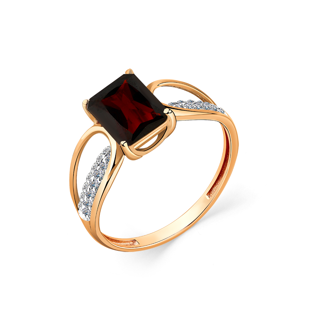 Необычный дизайн привлекательного кольца из красного золота 585 пробы отлично дополнит стильный образ современной леди. Объемный декор с мерцающими дорожками фианитов и эффектным гранатом изысканно украсит неповторимый образ владелицы. Приобретайте ювелирное украшение для себя или в подарок по выгодным ценам в магазинах Мир Золота.