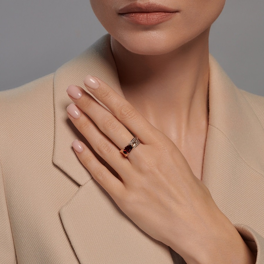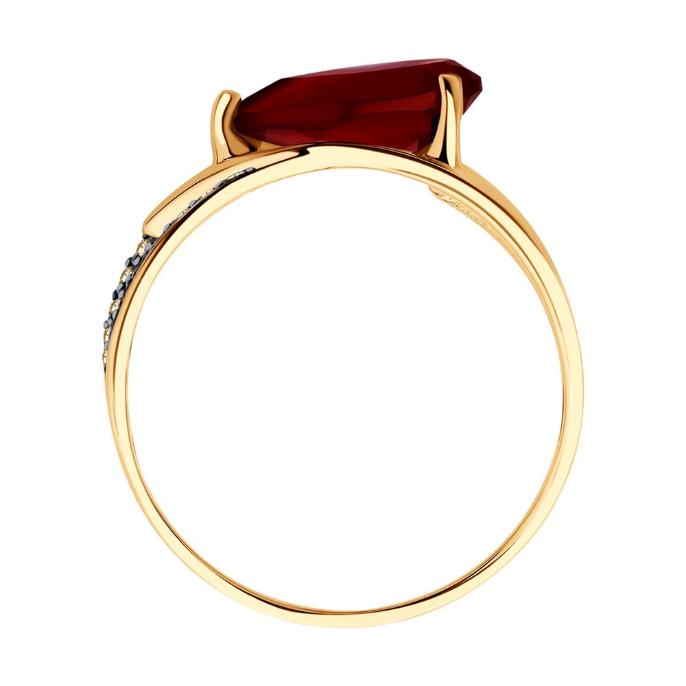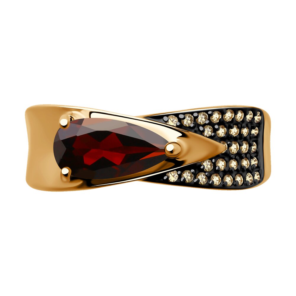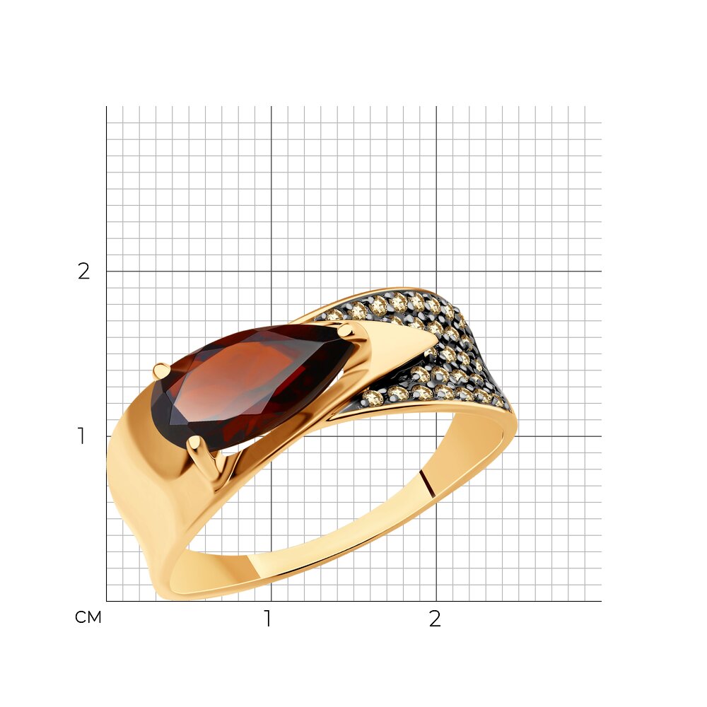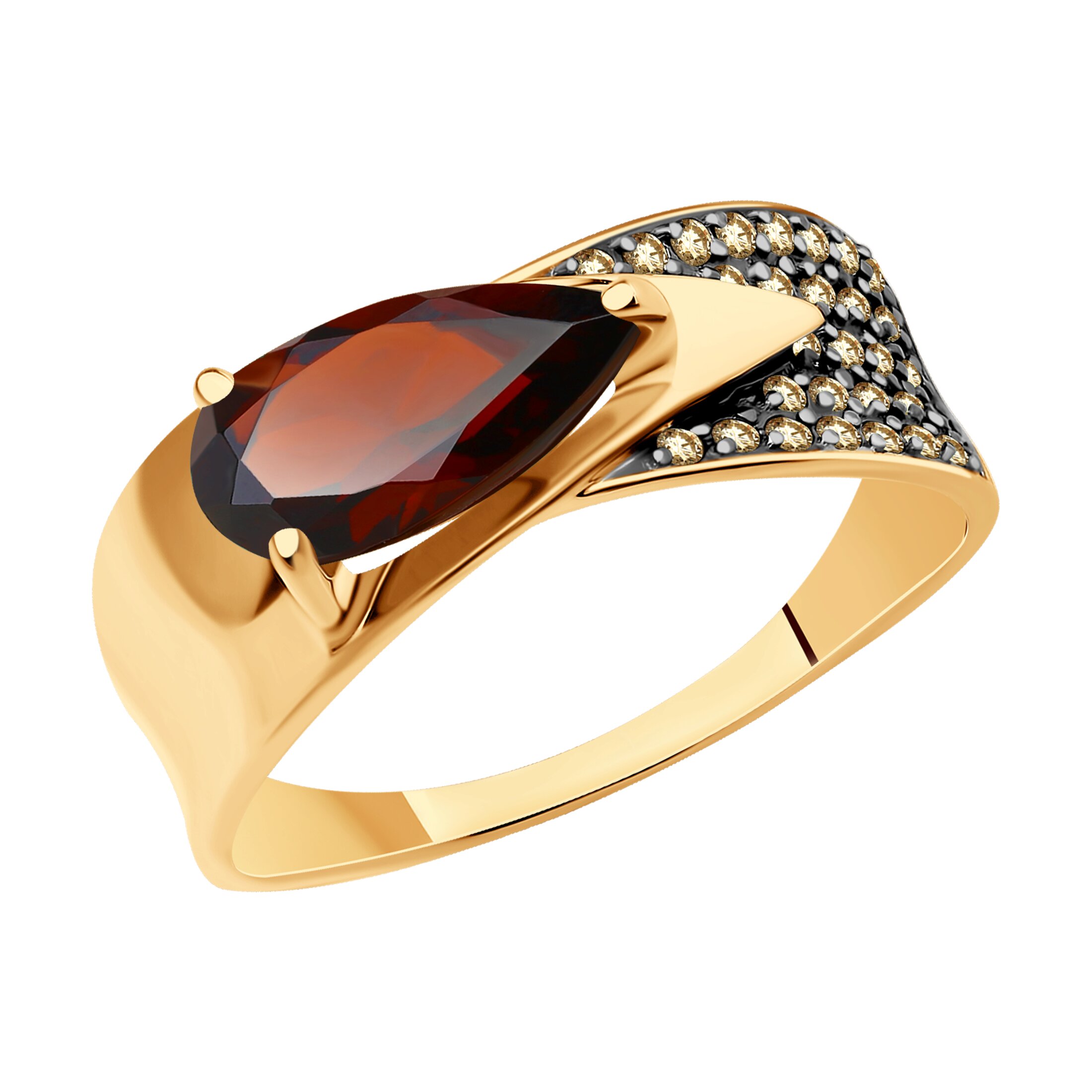 Превосходное кольцо из красного золота 585 пробы декорировано бесподобным сиянием натурального граната на фоне россыпи из желтых фианитов. Заметное стильное кольцо эффектно смотрится, и отлично дополнит классический элегантный образ обладательницы. Приобретайте привлекательное украшение по выгодным ценам в магазинах Мир Золота.
