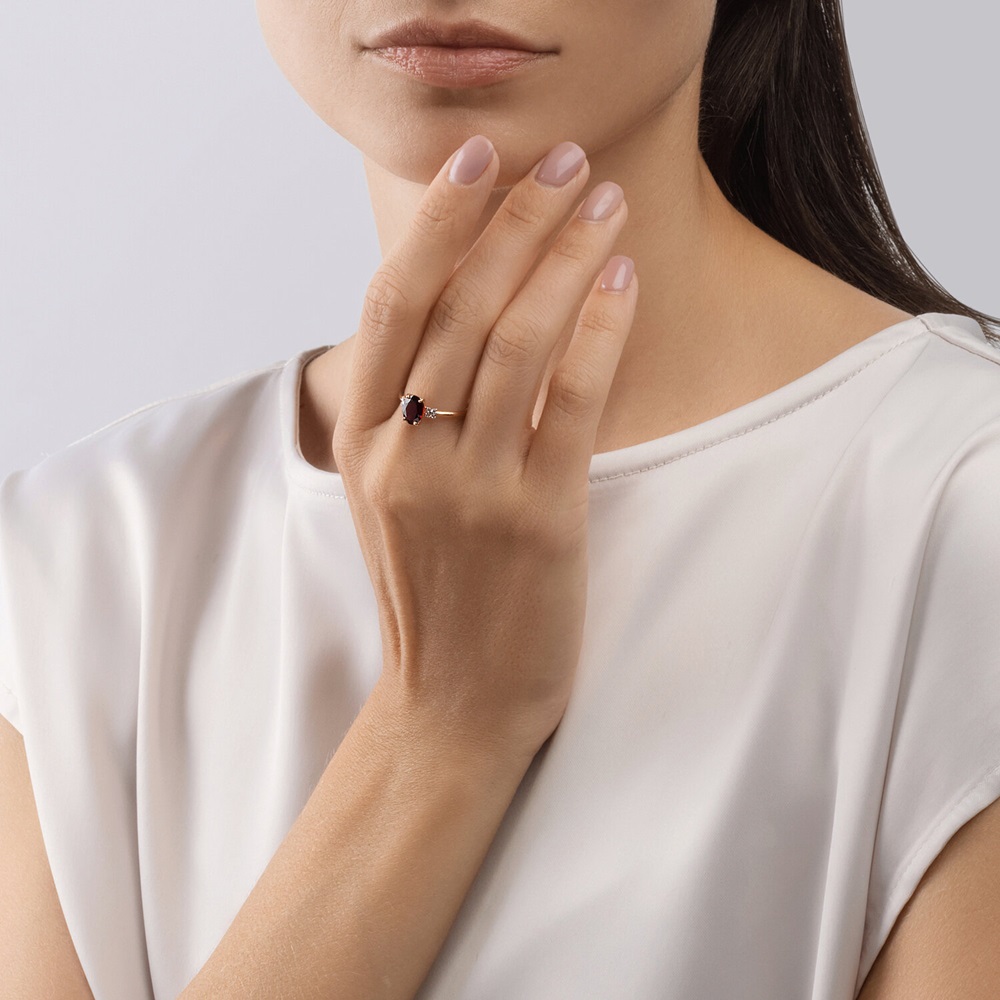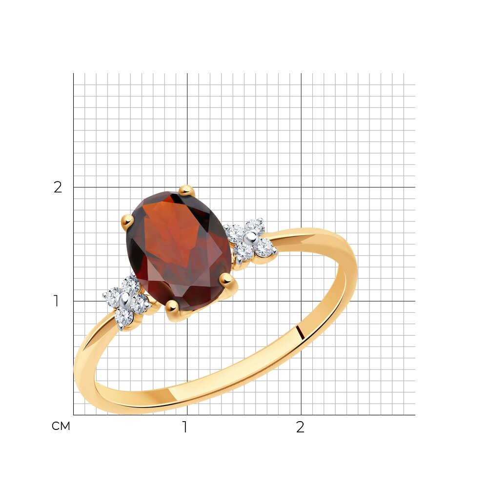 Замечательное кольцо из красного золота 585 пробы, декорировано крупным гранатом в эффектной закрепке, позволяющей свету проникать со всех сторон, раскрывая всю красоту камня. Сверкающие цветочки из прозрачных фианитов удачно подчеркивают насыщенное сияние граната. Кольцо сделает привычный образ женщины более манящим и притягательным. Покупайте ювелирное украшение выгодно в магазинах Мир Золота.