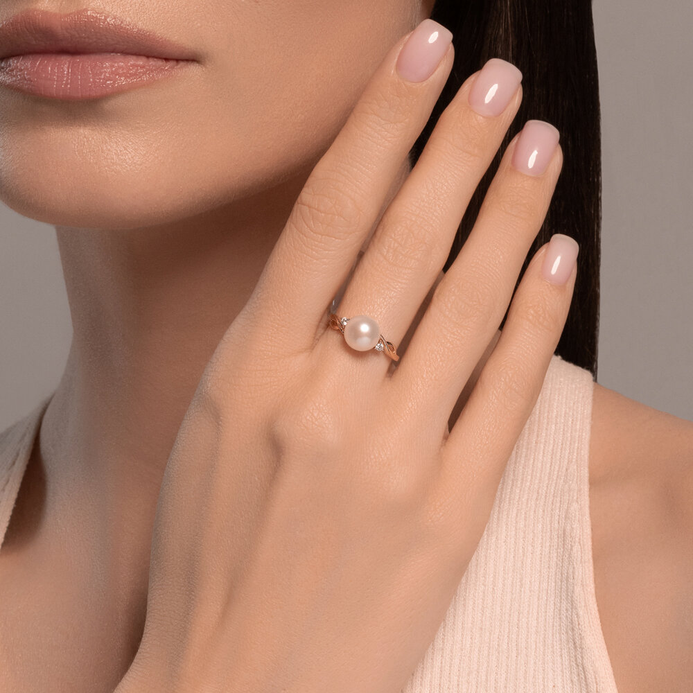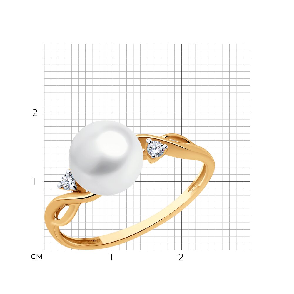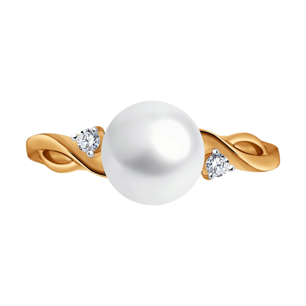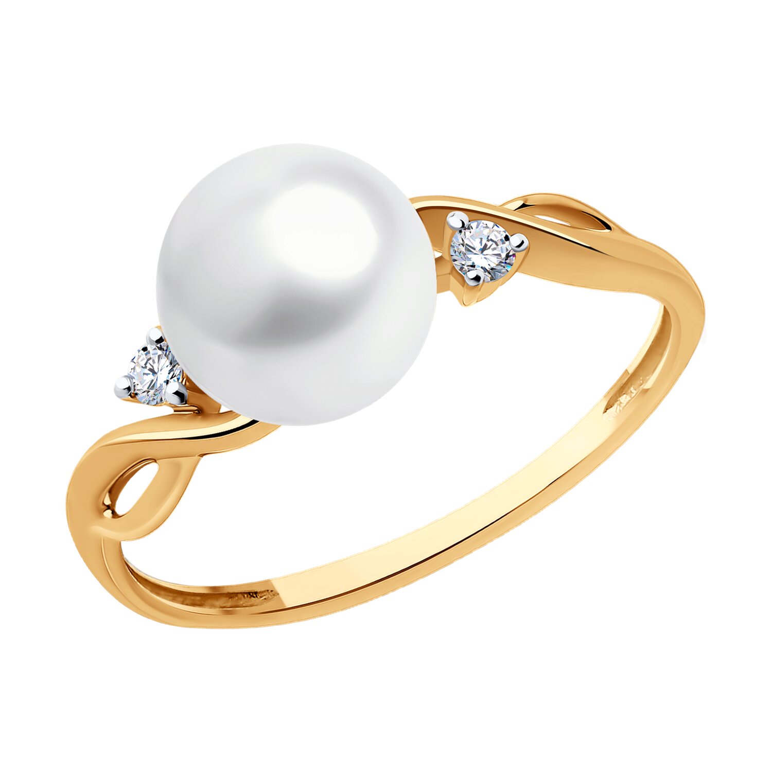 Кольцо выполнено в изящном дизайне из красного золота 585 пробы и декорировано прекрасным белым жемчугом и капельками искристых фианитов. Очаровательное украшение очень нежно и элегантно смотрится на руке, и будет хорошо сочетаться с серьгами из комплекта. Приобретайте ювелирное украшение с жемчугом по выгодной цене в магазинах Мир Золота.