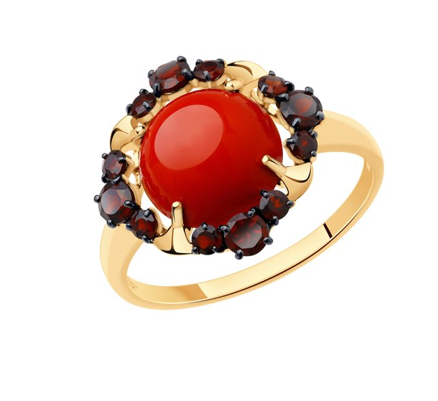 Кольцо из красного золота с кораллом и гранатами