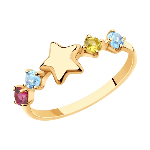 Изящное тонкое кольцо из красного золота 585 пробы, украшенное декоративной звездой и полудрагоценными вставками с родолитом, цитрином и топазами, порадует владелицу очаровательным блеском цветных камней и милым дизайном. Золотое украшение освежит своим сиянием любой привычный образ, и станет чудесным подарком. Приобретайте кольцо по выгодным ценам в магазинах Мир Золота.