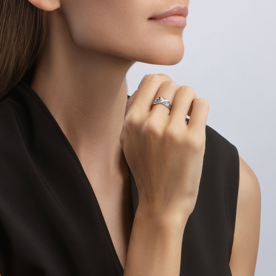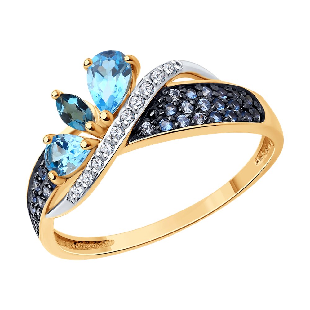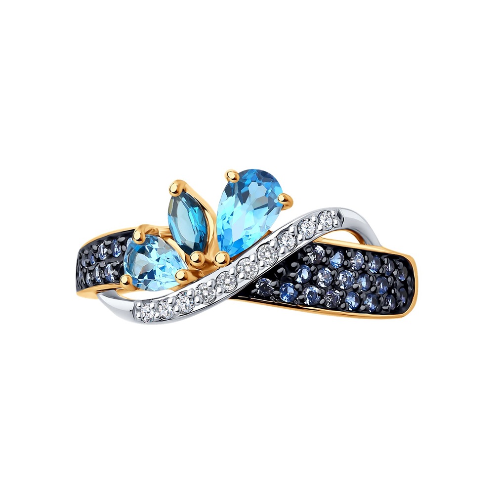 Изящное и нежное кольцо с голубыми топазами и разноцветными фианитами выполнено из красного золота 585 пробы. Эффектное сочетание переливчатого блеска цветных и прозрачных камней сделает образ владелицы более ярким и восхитительным, украшение будет особенно нарядно смотреться в комплекте с серьгами. Приобретайте кольцо в подарок по выгодной цене в магазинах Мир Золота.