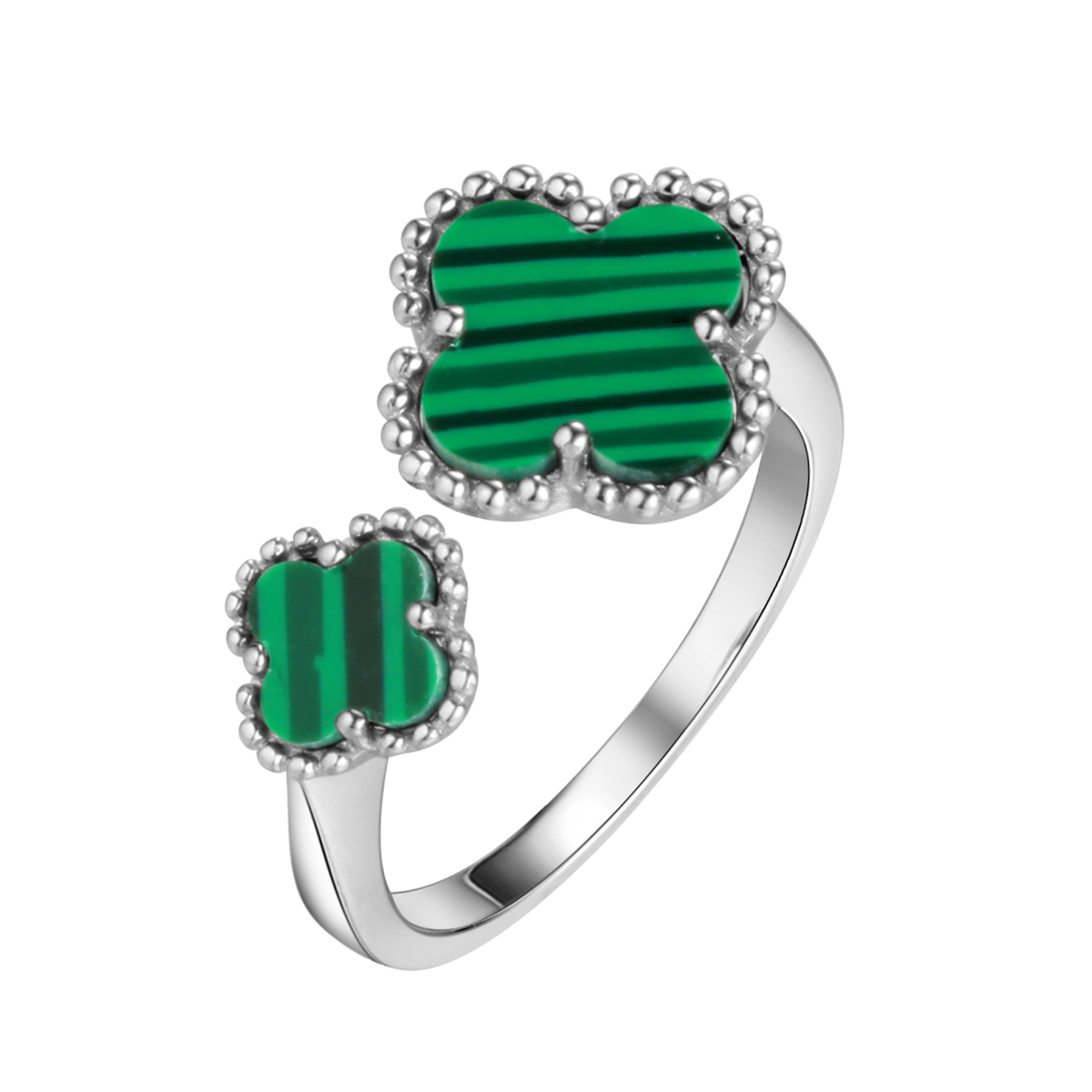 Стильное кольцо из родированного серебра 925 пробы, с декором в виде клевера с искусственным малахитом, станет заметным акцентом современного образа обладательницы. Символичное украшение эффектно украсит повседневный стиль, и дополнит женский образ особым шармом и очарованием. Приобретайте украшение по выгодным ценам в магазинах Мир Золота.