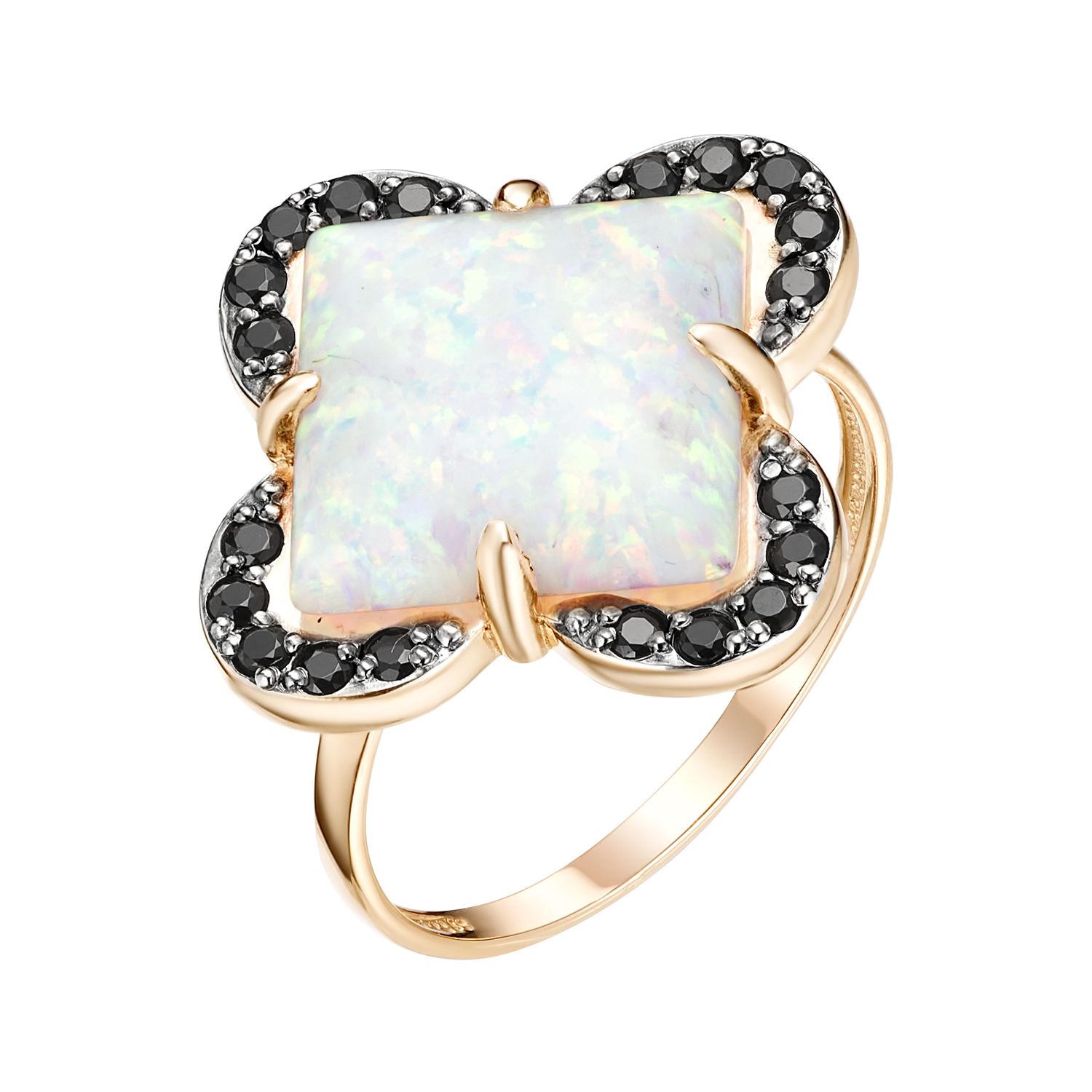 Привлекательное кольцо в форме четырёхлистника с завораживающим опалом и черными фианитами выполнено из красного золота 585 пробы. Эффектное кольцо смотрится очень стильно и современно, необычное яркое сочетание ювелирных камней привлекает внимание. Приобретайте модное и символичное украшение для себя или в подарок по выгодной цене в магазинах Мир золота.