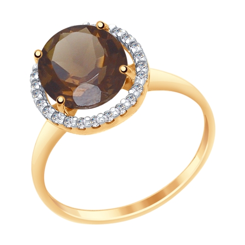 Классическое кольцо с превосходным раухтопазом в окружении искристых фианитов выполнено из красного золота 585 пробы. Благодаря тонкой шинке крупный камень выглядит особенно эффектно, мерцающий блеск фианитов придает изделию более нарядный вид. Украшение смотрится благородно и достойно, и будет прекрасным подарком для женщины. Приобретайте кольцо выгодно в магазинах Мир Золота.
