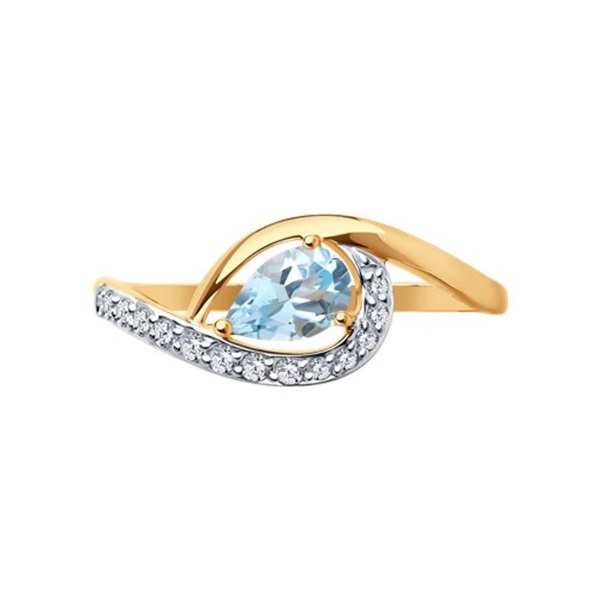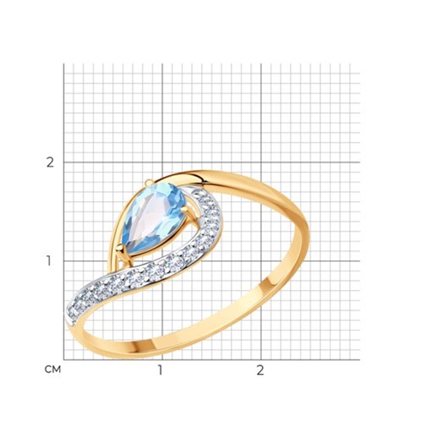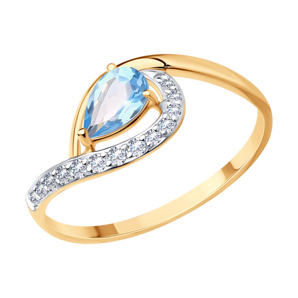 Изящное кольцо с голубым топазом и фигурной дорожкой с прозрачными фианитами выполнено из красного золота 585 пробы. Утонченное украшение с изумительным блеском ювелирных камней идеально дополнит нежный женственный образ, и будет замечательным подарком по любому поводу. Приобретайте золотое украшение по выгодной цене в магазинах Мир Золота.