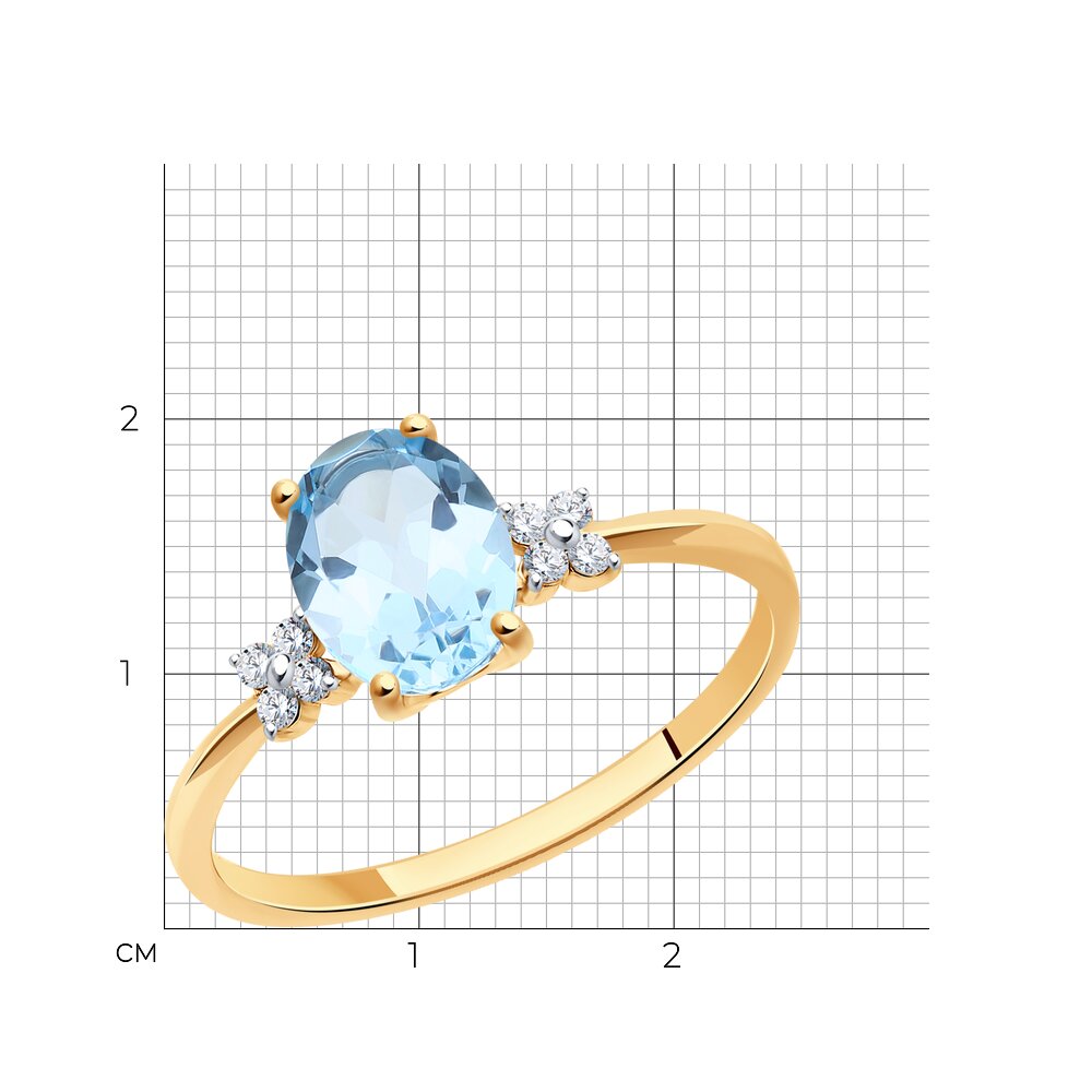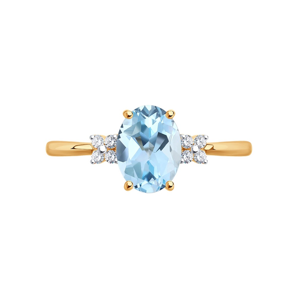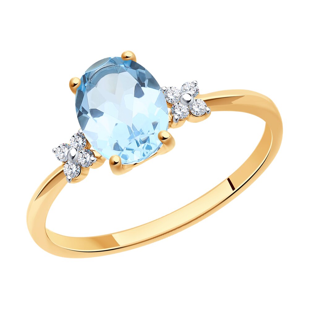 Очаровательное кольцо из красного золота 585 пробы украшено голубым топазом и изящными фианитовыми вставками. Привлекательный дизайн станет неотъемлемой деталью изящного женственного образа, дополнив его изумительным блеском ювелирных камней. Утонченное украшение очень нежно смотрится на руке, и будет замечательным подарком для женщины. Приобретайте кольцо по выгодной цене в магазинах Мир Золота.