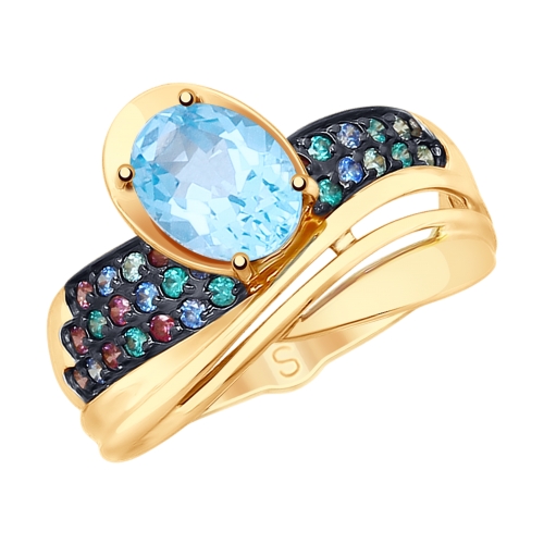 Превосходное кольцо из красного золота 585 пробы с голубым топазом и россыпью разноцветных фианитов, несомненно, привлечет внимание окружающих. Эффектная вставка подчеркивает удивительную красоту и нежный блеск топаза, искристое сияние разноцветных фианитов дополняет яркий образ украшения. Приобретайте изысканное кольцо в подарок по выгодной цене в магазинах Мир Золота.