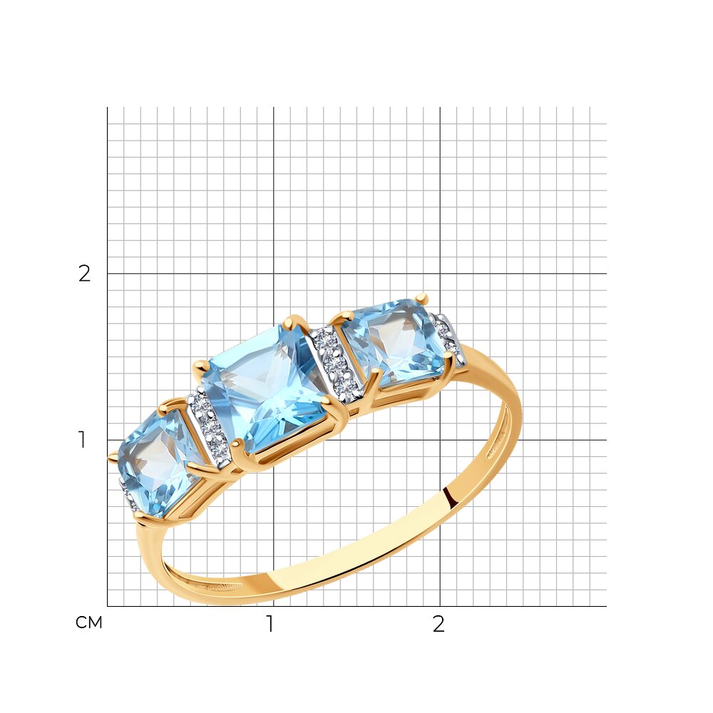 Привлекательное кольцо с нежно-голубыми топазами, разбавленными вставками с кристальными фианитами, выполнено из красного золота 585 пробы. Стильная композиция из ювелирных камней привлекает внимание, покоряя своей красотой и чистым прозрачным блеском. С этим аксессуаром вы сможете легко создать свой идеальный образ. Покупайте ювелирное украшение по выгодной цене в магазинах Мир Золота.
