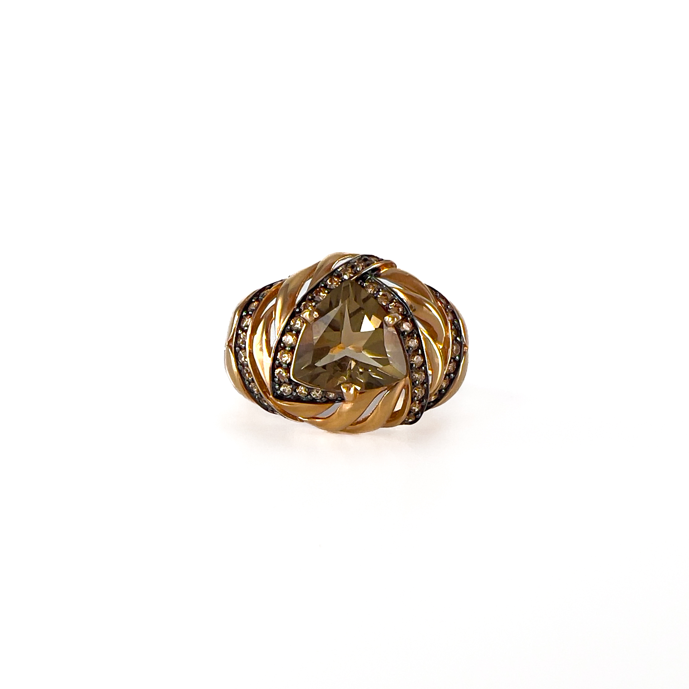 Современное женское кольцо из красного золота 585 пробы с загадочным раухтопазом в окружении фианитов украсит безупречный образ своей прекрасной обладательницы. Сияющие коричневые фианиты придают украшению особую элегантность. Покупайте золотые украшения исключительного качества по привлекательной цене в магазинах Мир Золота.