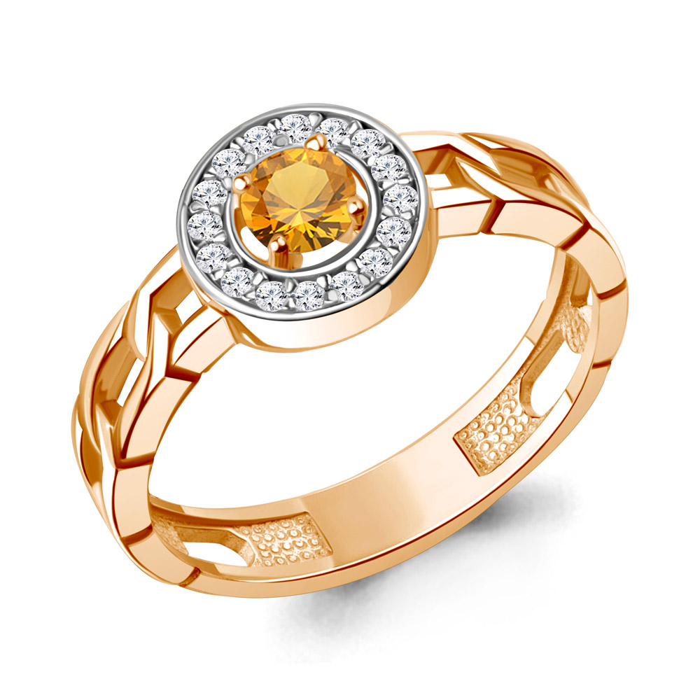 Привлекательное кольцо из красного золота 585 пробы с солнечным цитрином и фианитами приковывает внимание своим необычным дизайном и блеском камней. Цитрин круглой огранки в сочетании с мягким драгоценным металлом смотрится ярко и притягательно; украшение наполнит женственный образ особым шармом и теплым сиянием. Приобретайте ювелирное кольцо по выгодной цене в магазинах Мир Золота.