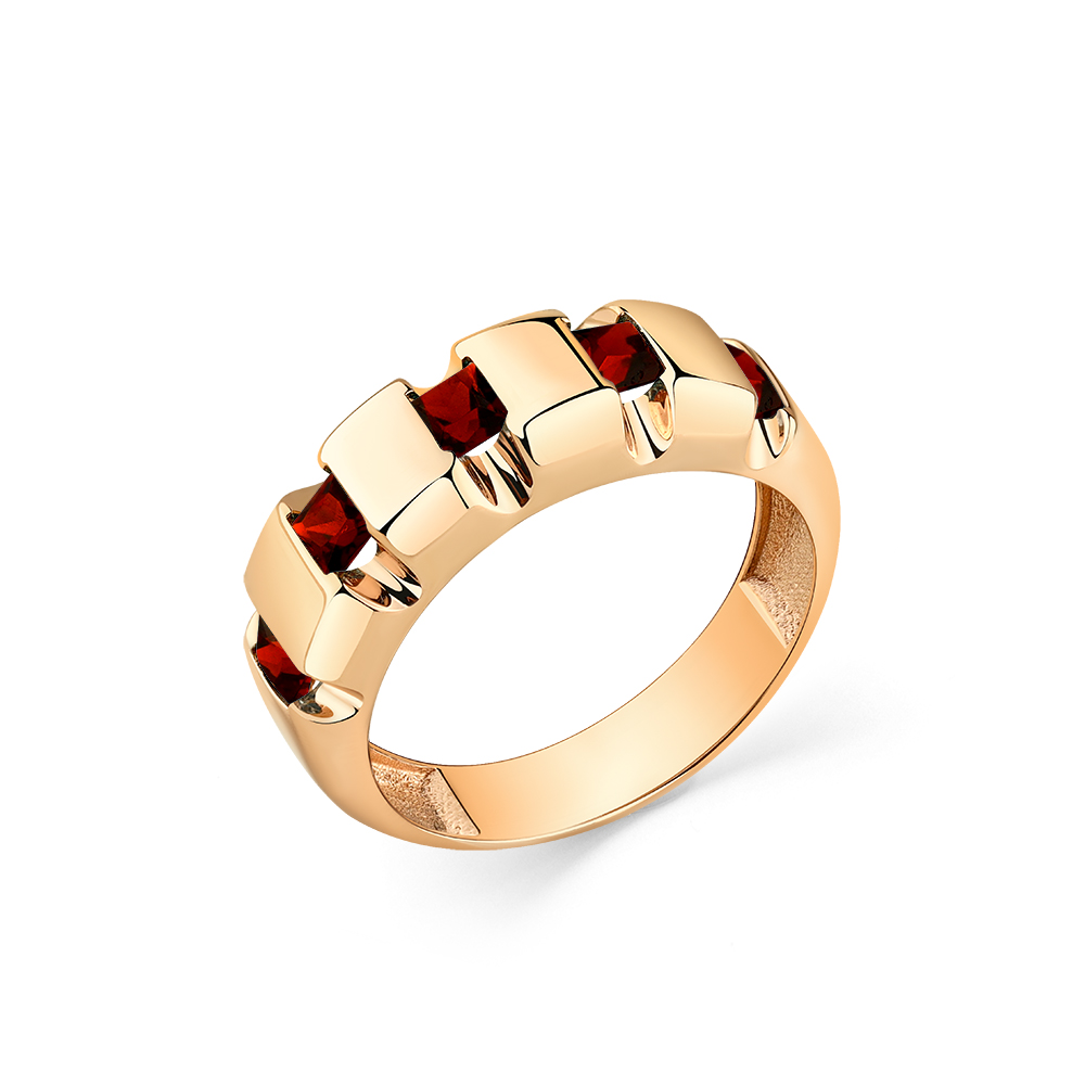 Эффектное кольцо стильного дизайна выполнено из красного золота 585 пробы и декорировано вставками с квадратными гранатами. Выразительное украшение несомненно привлечет внимание окружающих, и отлично подчеркнет индивидуальность и безупречность женского образа. Приобретайте ювелирное украшение с гранатами для себя или в подарок по выгодным ценам в магазинах Мир Золота.