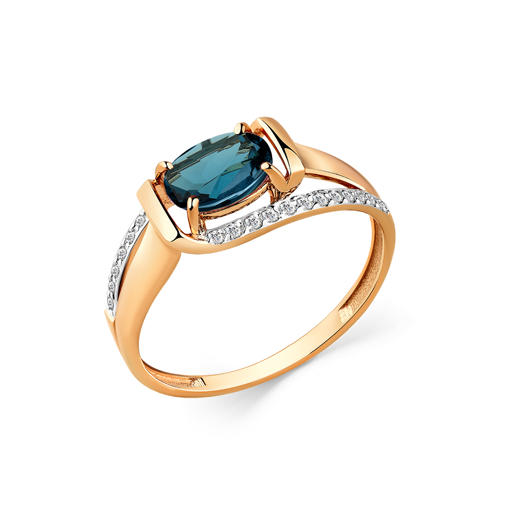 Кольцо привлекательного ювелирного дизайна с топазом Лондон и дорожками кристальных фианитов выполнено из красного золота 585 пробы. Кольцо с главным акцентом топаза спокойного глубокого оттенка станет изысканным дополнением женственного образа, и подчеркнет утонченный вкус владелицы. Приобретайте ювелирное украшение по выгодной цене в магазинах Мир Золота.
