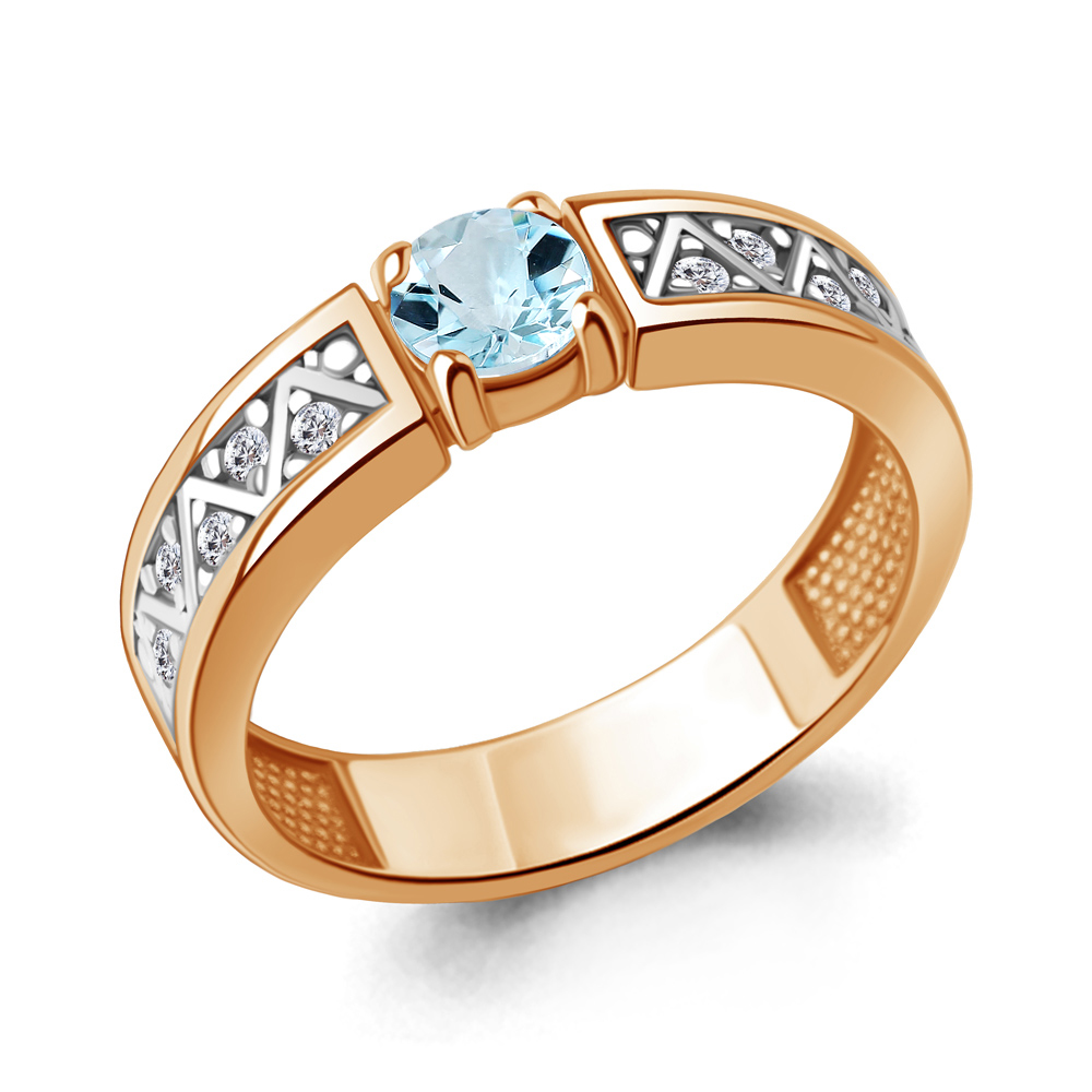 Кольцо из красного золота 585 пробы привлекает внимание своим оригинальным декором с россыпью прозрачных фианитов и завораживающим сиянием нежно-голубого топаза sky. Притягательное украшение отлично впишется в классические и современные образы, и идеально подойдет для тех, кто хочет выглядеть элегантно и стильно в любой ситуации. Приобретайте превосходное украшение по выгодным ценам в магазинах Мир Золота.