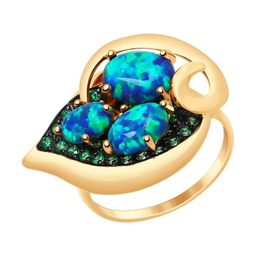 Кольцо необычного дизайна с синтетическими опалами и зелеными фианитами выполнено из красного золота 585 пробы. Объемный декор с яркими вставками с синими опалами на фоне россыпи из зеленых фианитов интересно смотрится и привлекает внимание, эффектное украшение заметно преобразит привычный женский образ. Приобретайте ювелирное кольцо по выгодной цене в магазинах Мир Золота.