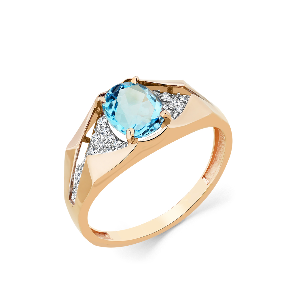 Кольцо современного ювелирного дизайна из красного золота 585 пробы украшено привлекательным топазом swiss, подчеркнутым россыпью сияющих фианитов. Стильный аксессуар с завораживающим блеском лазурного топаза добавит женскому образу утонченности и загадочной изюминки. Приобретайте изысканное кольцо в подарок по выгодным ценам в магазинах Мир Золота.