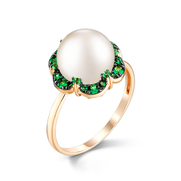 Яркое очаровательное кольцо из красного золота 585 пробы с культивированным жемчугом и фианитами. Чудесное украшение с контрастным блеском нежного жемчуга и зеленых фианитов эффектно смотрится на руке, и станет идеальным завершением неотразимого женственного образа. Приобретайте ювелирное украшение в подарок по выгодным ценам в магазинах Мир Золота.