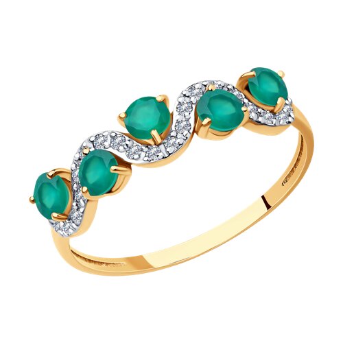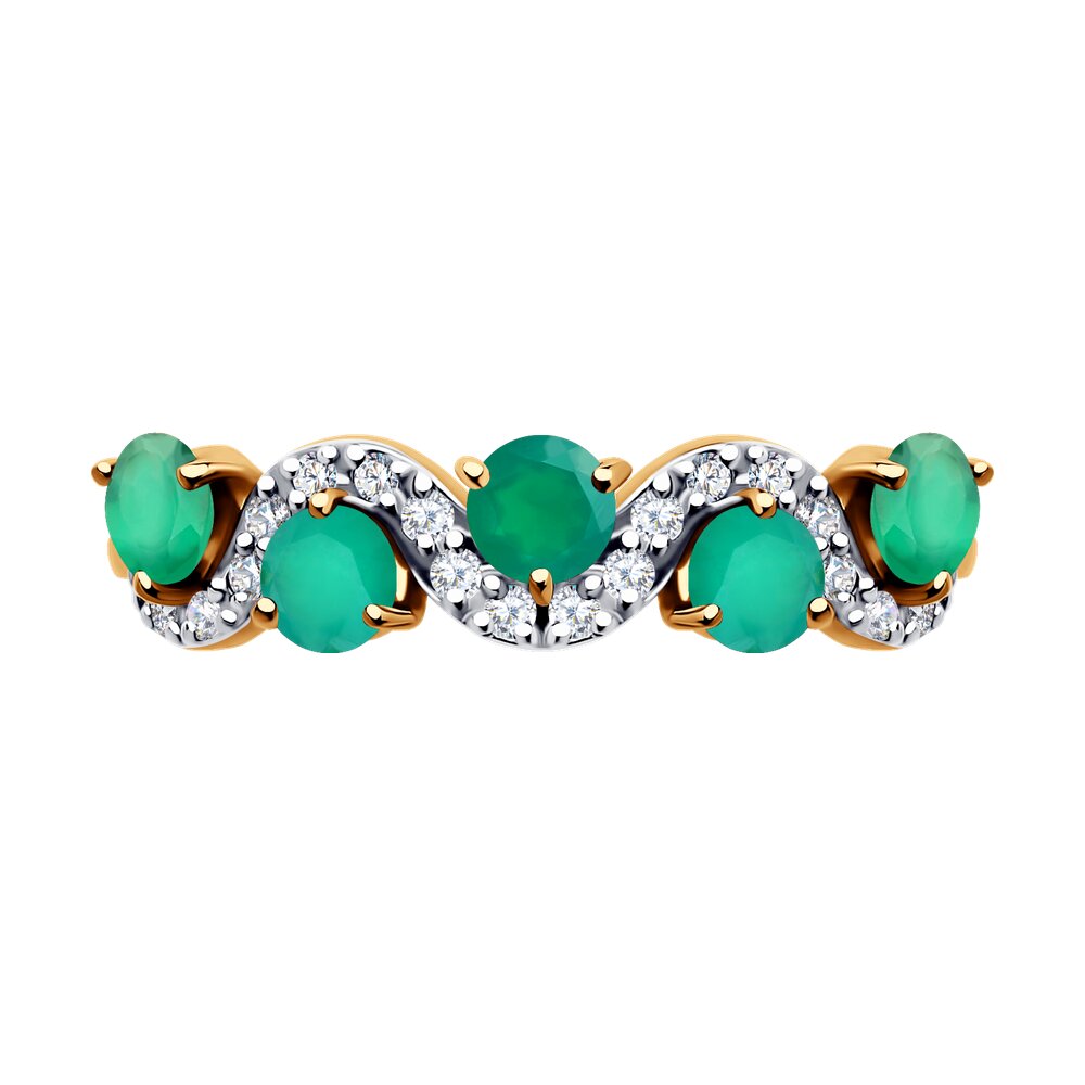 Декоративное кольцо из красного золота 525 пробы с агатами и фианитами. Яркие зеленые агаты круглой огранки в сочетании с искристым блеском прозрачных фианитов создают эффектный образ украшения. Блеск красного золота выгодно дополняет сияние камней. Приобретайте ювелирное украшение для себя или в подарок выгодно в магазинах Мир Золота.