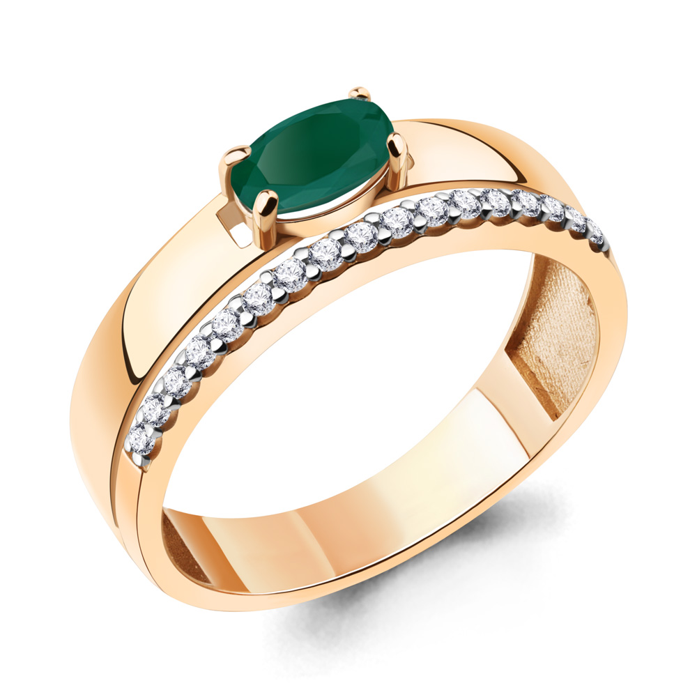 Привлекательное кольцо из красного золота 585 пробы декорировано зеленым агатом овальной формы огранки и дорожкой прозрачных фианитов. Яркий агат отлично вписывается в изящный дизайн украшения, плавные линии благородного золота выгодно подчеркивают его насыщенный блеск. Замечательное украшение заметно преобразит привычный образ, и сделает его еще более женственным и очаровательным. Покупайте кольцо выгодно в магазинах Мир Золота.