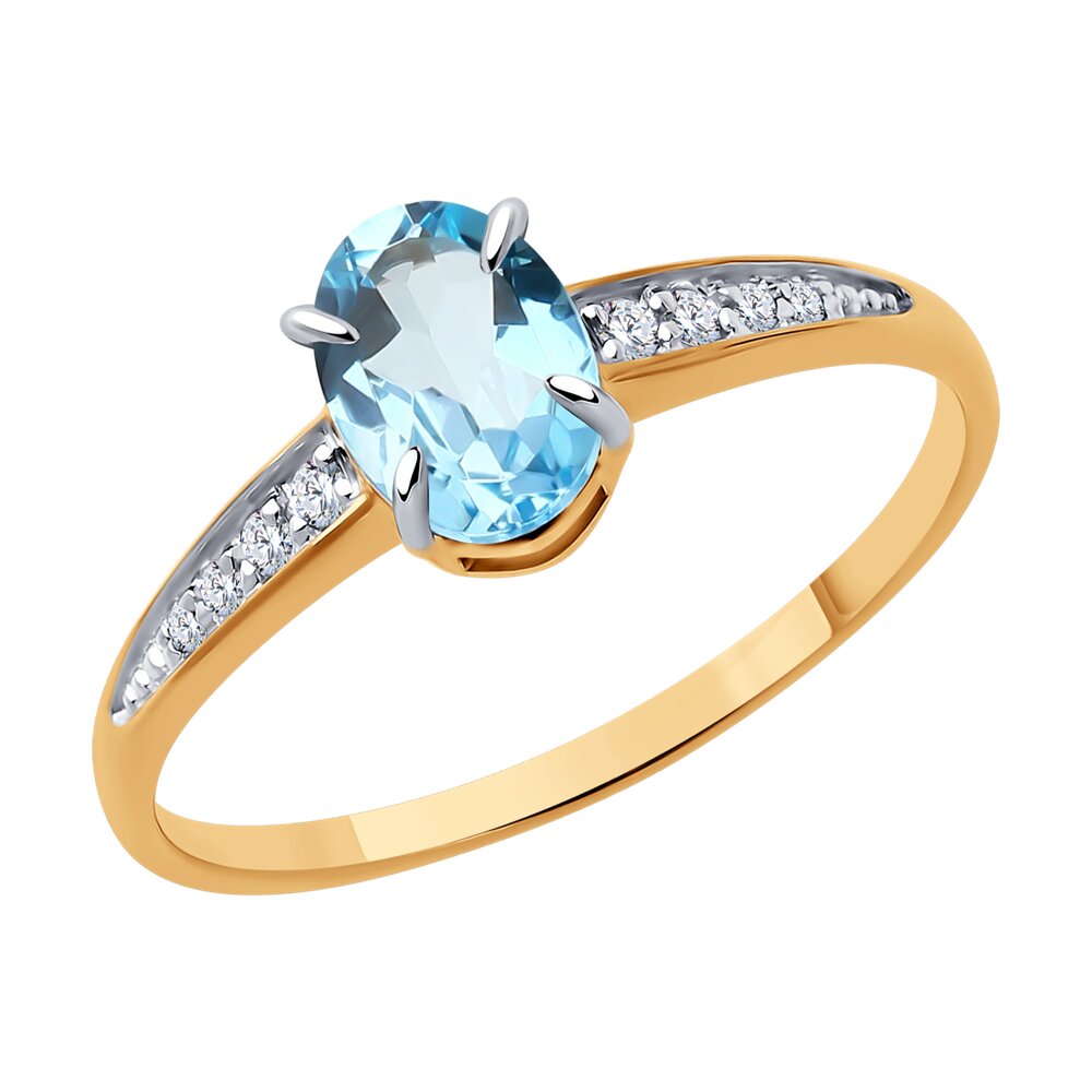 Декоративное кольцо из красного золота представляет собой истинное произведение ювелирного искусства. Особый шарм кольцу придает центральный камень — голубой топаз, играющий световыми бликами. Украшение дополнено сверкающими фианитами, создающими визуальную легкость и воздушность. Таким образом, кольцо выглядит одновременно элегантно и современно, дополняя любые образы.