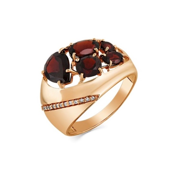 Широкое кольцо из красного золота 585 пробы с натуральными гранатами и искристой дорожкой с фианитами эффектно дополнит превосходный женственный образ. Яркие насыщенные гранаты приковывают внимание, благородное сияние золота идеально подчеркивает глубокий блеск камней. Приобретайте ювелирное украшение по выгодным ценам в магазинах Мир Золота.