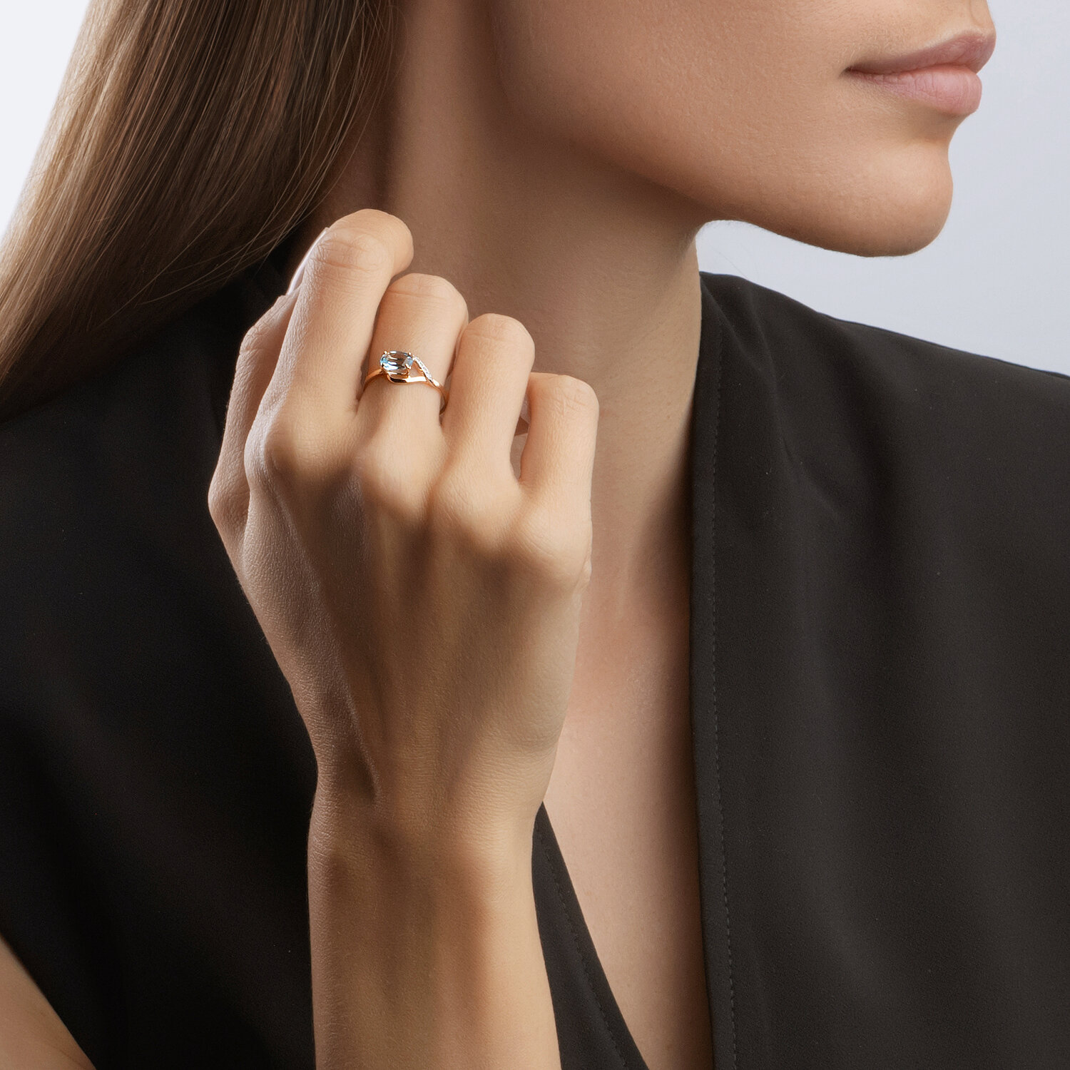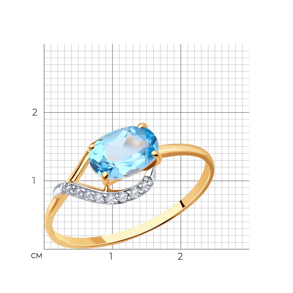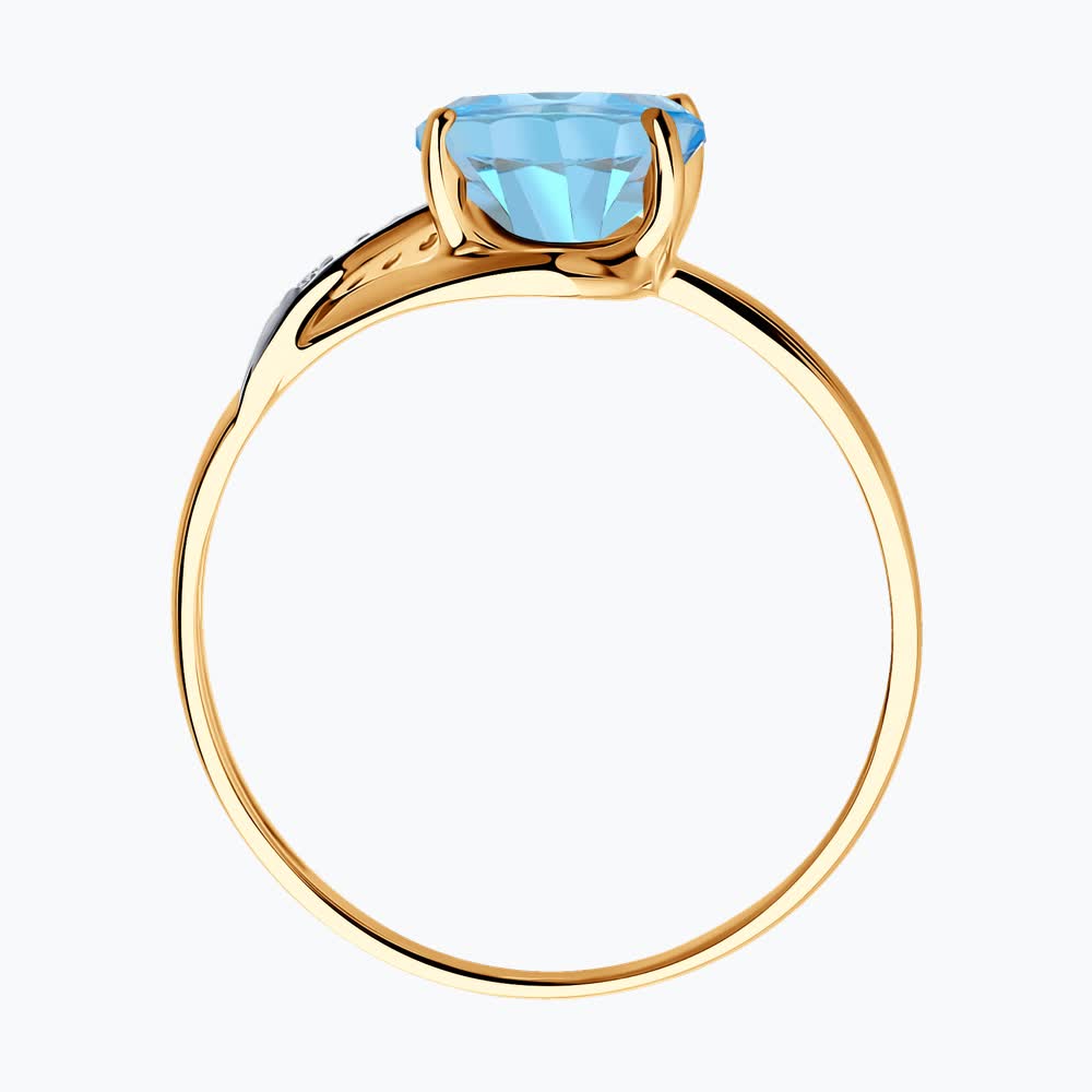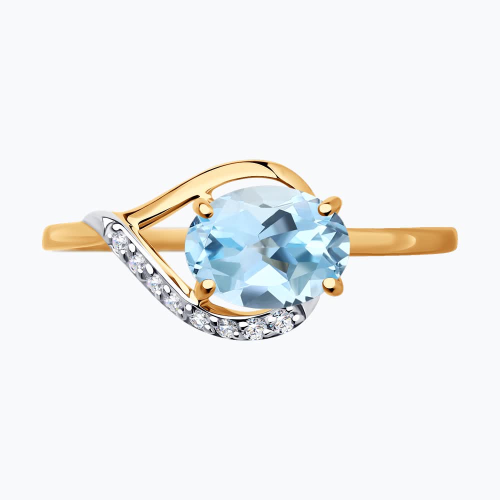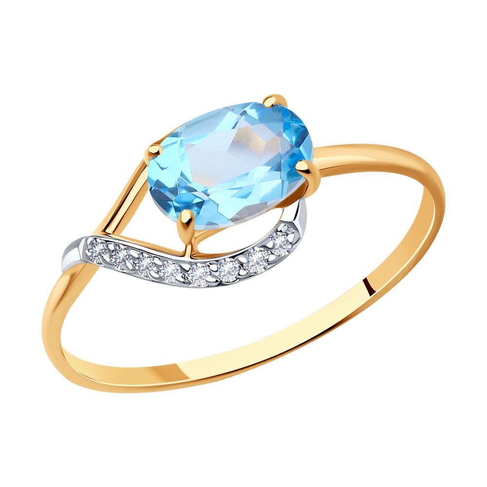 Декоративное женское кольцо из красного золота, притягивающего взгляд своим солнечным сиянием. Акцент изделия — яркий овальный топаз небесно-голубого оттенка, заключённый в изящную оправу. Небольшие фианиты подчеркивают глубину и чистоту солирующего камня. Приобретайте украшение для себя или в подарок выгодно в магазинах Мир Золота.