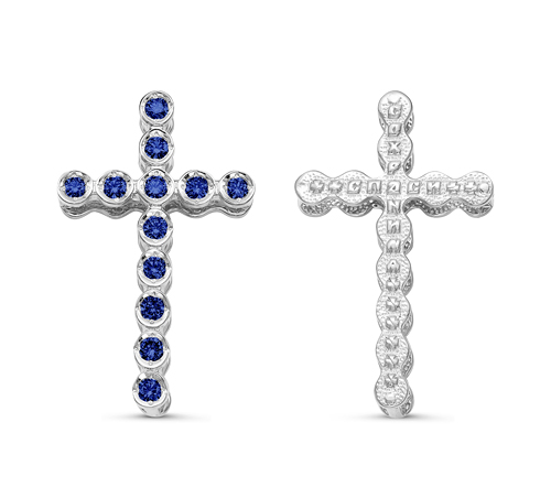 Красивый декоративный крестик с натуральными темно-синими сапфирами в белом золоте высшей 585 пробы подчеркнет утонченный вкус и станет уместным дополнением любого наряда. Белое золото с холодным и спокойным сиянием лучше всего оттеняет и раскрывает красоту сапфиров. Такой стильный крестик будет одинаково красиво смотреться как с золотой цепочкой, так и с кожаным или каучуковым шнурком.
