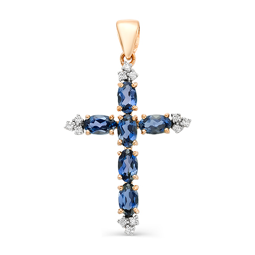 Декоративный крестик из красного золота 585 пробы с сапфировыми корундами и прозрачными фианитами. Яркое украшение с эффектным сиянием ювелирных камней станет выразительным завершением индивидуального образа и стильным аксессуаром на каждый день. Приобретайте крестик для себя или подарок по выгодным ценам в магазинах Мир Золота.