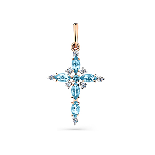 Декоративный крестик с натуральными голубыми топазами swiss и фианитами выполнен в изящном дизайне из красного золота 585 пробы. Удивительный блеск лазурных топазов, подчеркнутых кристальными фианитами, привлекает внимание, и сделает образ владелицы более ярким и изысканным. Приобретайте подвеску для себя или в подарок своим близким по выгодной цене в магазинах Мир Золота.