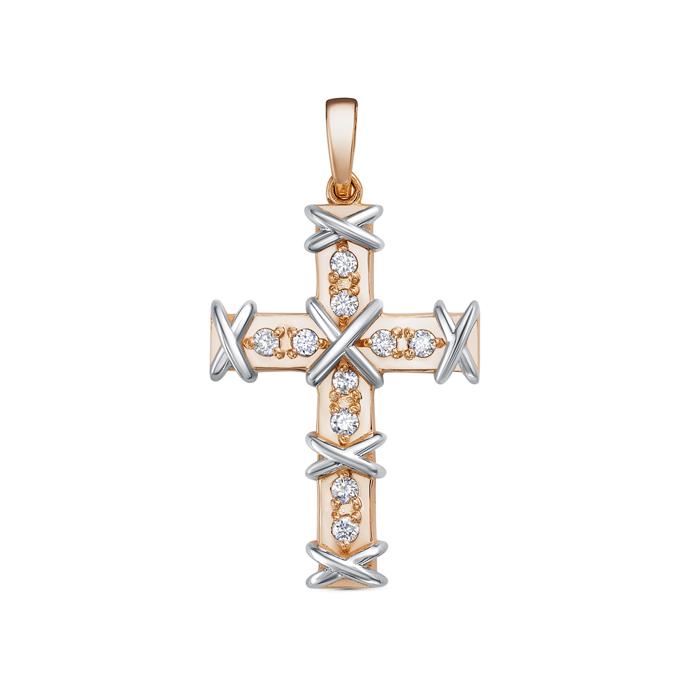 Декоративный крестик из красного и белого золота 585 пробы, украшенный ослепительными бриллиантами, станет великолепным дополнением стильного образа. Благородное золото выгодно подчеркивает природную красоту и завораживающее сияние драгоценных камней. Приобретайте изысканное украшение современного дизайна по выгодной цене в магазинах Мир Золота.