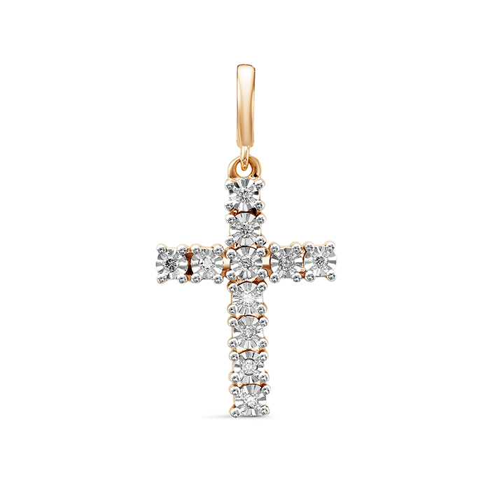 Декоративный крестик из красного золота 585 пробы украшен натуральными бриллиантами. Закрепки из белого золота выгодно подчеркивают природную красоту и изысканное сияние драгоценных камней. Символичное украшение станет изысканным дополнением повседневных образов современной леди. Приобретайте подвеску по выгодным ценам в магазинах Мир Золота.