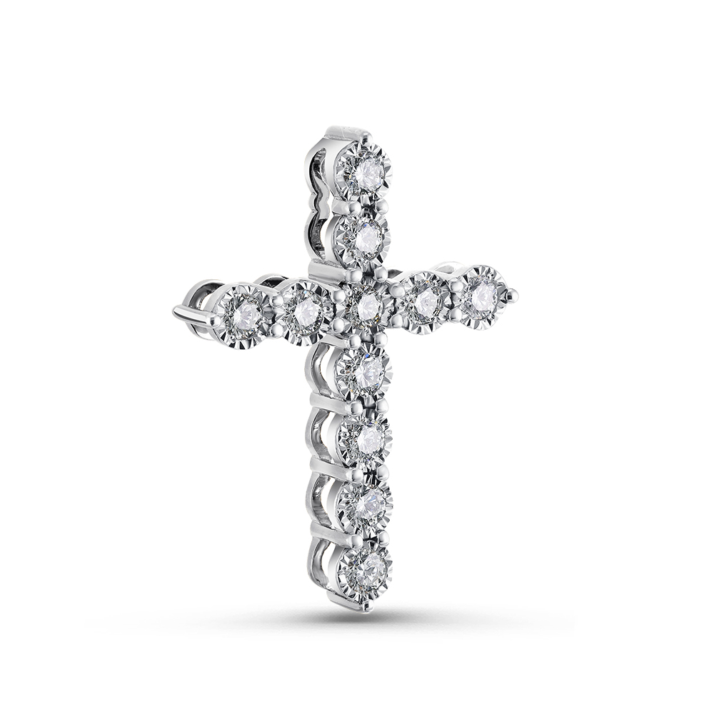 Декоративный крестик из белого золота 585 пробы инкрустирован великолепными бриллиантами, подчеркнутыми дополнительным блеском алмазной грани. Блистательное украшение станет яркой деталью женского образа, и сделает его более изысканным. Золотой крестик с драгоценными камнями - отличный выбор для символичного подарка и эффектного украшения. Приобретайте подвеску по выгодным ценам в магазинах Мир Золота.
