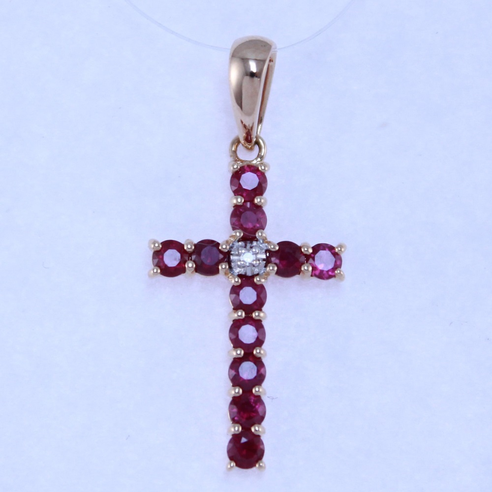 Декоративный крестик из красного золота 585 пробы, инкрустированный натуральными рубинами и миниатюрным бриллиантом, станет ярким акцентом женского образа. Стильный аксессуар с изысканным блеском драгоценных камней - отличный выбор для символичного подарка и эффектного украшения. Приобретайте подвеску по выгодным ценам в магазинах Мир Золота.
