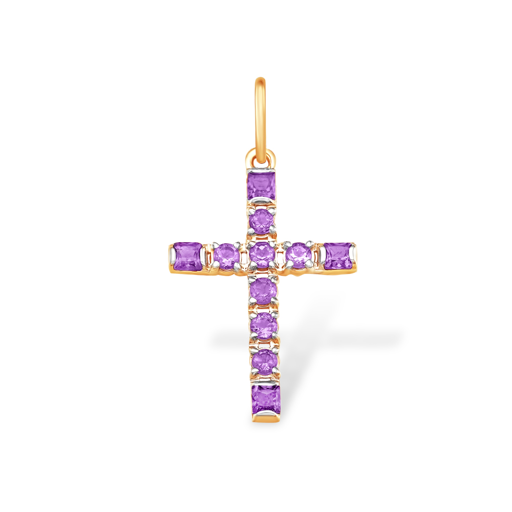Декоративный крестик из красного золота 585 пробы, оформленный прекрасными аметистами квадратной и круглой формы огранки, изящно и привлекательно смотрится, и подчеркнет женственность и очарование владелицы. Золотой крестик с драгоценными камнями - отличный выбор для символичного подарка и эффектного украшения. Приобретайте подвеску по выгодным ценам в магазинах Мир Золота.