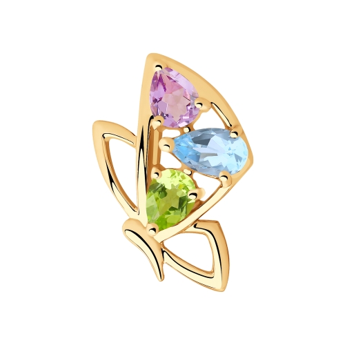 Изящная подвеска в виде бабочки, украшенная разноцветными полудрагоценными камнями, выполнена из красного золота 585 пробы. Романтичный стиль украшения добавит нотку шарма и очарования в привычный женственный образ, и будет изысканной деталью повседневного или вечернего наряда. Приобретайте ювелирное украшение по выгодным ценам в магазинах Мир Золота.