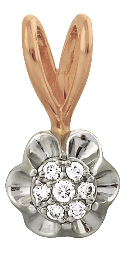 Очаровательная подвеска из красного и белого золота 585 пробы с бриллиантами. Изящная вставка выполнена из белого золота в виде цветочка с композицией прозрачных бриллиантов. Симпатичное украшение отлично дополнит нежный романтичный стиль, и эффектно украсит повседневный образ владелицы. Приобретайте подвеску по выгодным ценам в магазинах Мир Золота.