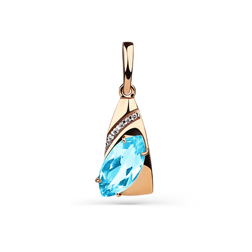Стильная подвеска из красного золота 585 пробы с голубым топазом swiss и фианитами выполнена в современном дизайне. Изумительный яркий топаз утонченной формы огранки выгодно подчеркнут благородным блеском золота и сверкающими фианитами, и является главным акцентом в образе украшения. Подвеска станет универсальным аксессуаром для любого наряда, и добавит загадочного блеска в выбранный образ. Приобретайте украшение выгодно в магазинах Мир Золота.