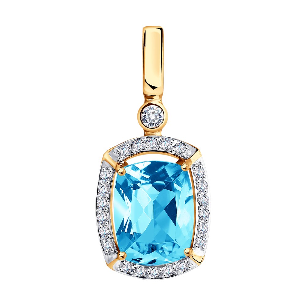 Превосходная подвеска с крупным голубым топазом swiss в окружении сверкающих фианитов выполнена из красного золота 585 пробы. Яркий блеск топаза насыщенного цвета завораживает взгляд, искристые фианиты подчёркивают его неотразимую красоту и сияние. Украшение достойно и благородно смотрится, и подчеркнет безупречный вкус владелицы. Приобретайте подвеску в подарок по выгодной цене в магазинах Мир Золота.