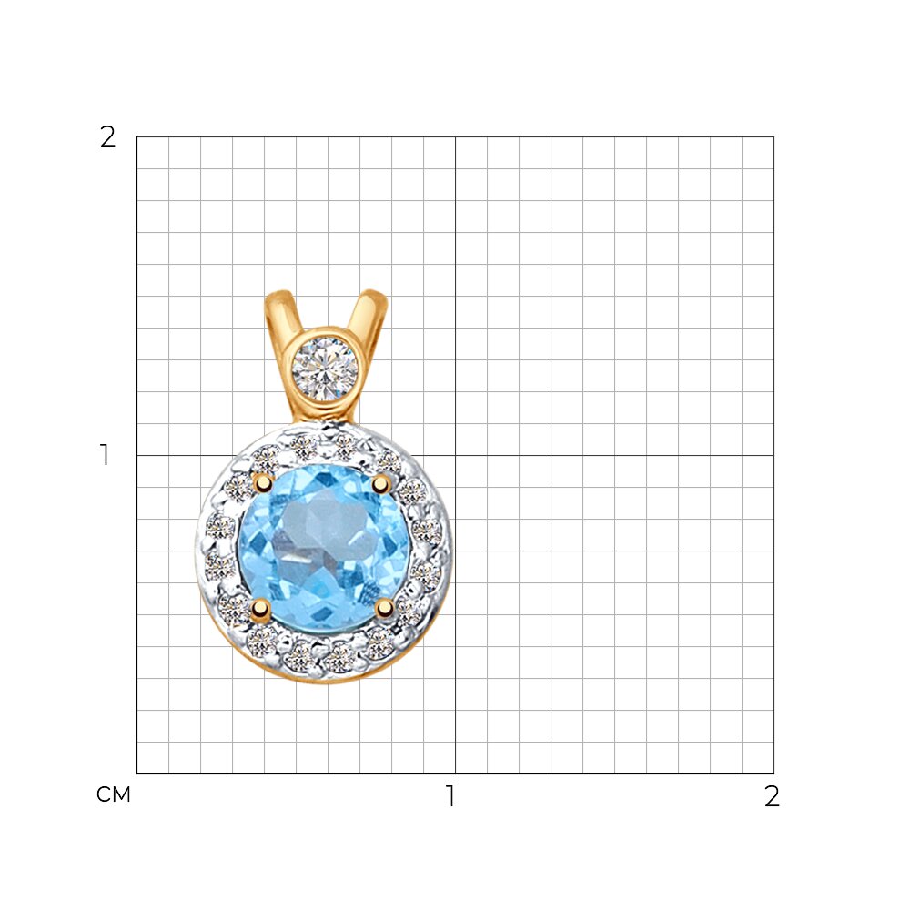 Круглая подвеска из красного золота 585 пробы с голубым топазом и кристальными фианитами подчеркнет женственность и очарование владелицы. Чудесная подвеска с нежным прозрачным блеском топаза в окружении искристых фианитов будет универсальным украшением для любого образа и наряда. Покупайте подвеску для себя или в подарок выгодно в магазинах Мир Золота.