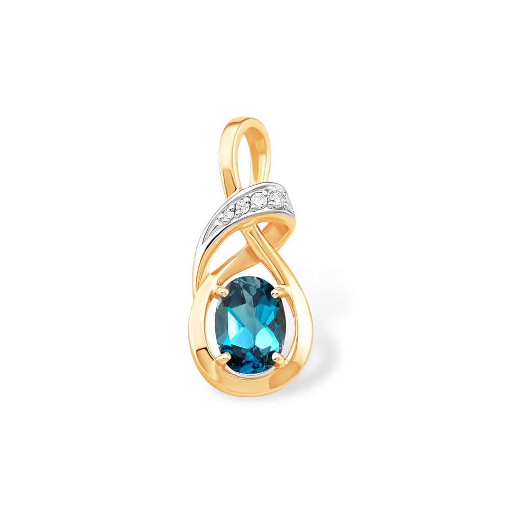 Изящная миниатюрная подвеска из красного золота 585 пробы с натуральным голубым топазом и кристальными фианитами очень нежно и женственно смотрится, и подойдет для тонкой цепочки. Украшение с изумительным блеском топаза в обрамлении плавных линий драгоценного золота станет изысканным акцентом выбранного образа. Приобретайте ювелирное украшение для себя или в подарок по выгодным ценам в магазинах Мир Золота.