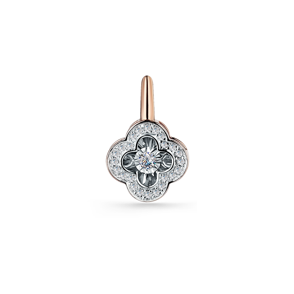 Очаровательная подвеска в форме символичного клевера из красного золота 585 пробы, декорированная драгоценными бриллиантами, понравится поклонницам современных трендов. Вставка из белого золота с «танцующим» бриллиантом привлекает внимание, алмазная грань усиливает блеск драгоценного камня, раскрывая его неповторимую красоту. Приобретайте актуальное украшение в подарок по выгодным ценам в магазинах Мир Золота.